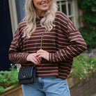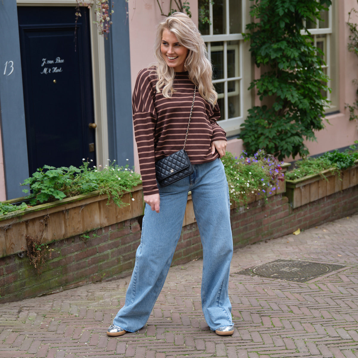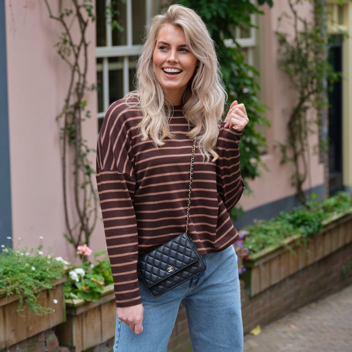 Deze leuke top heeft een tijdloos horizontaal streepdessin in een warme combinatie van donkerbruin en roze/beige. De wijde, oversized pasvorm, de ronde hals en de cropped lengte maken deze trui perfect om te combineren met een high-waist jeans. Maak het af met een gilet.