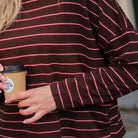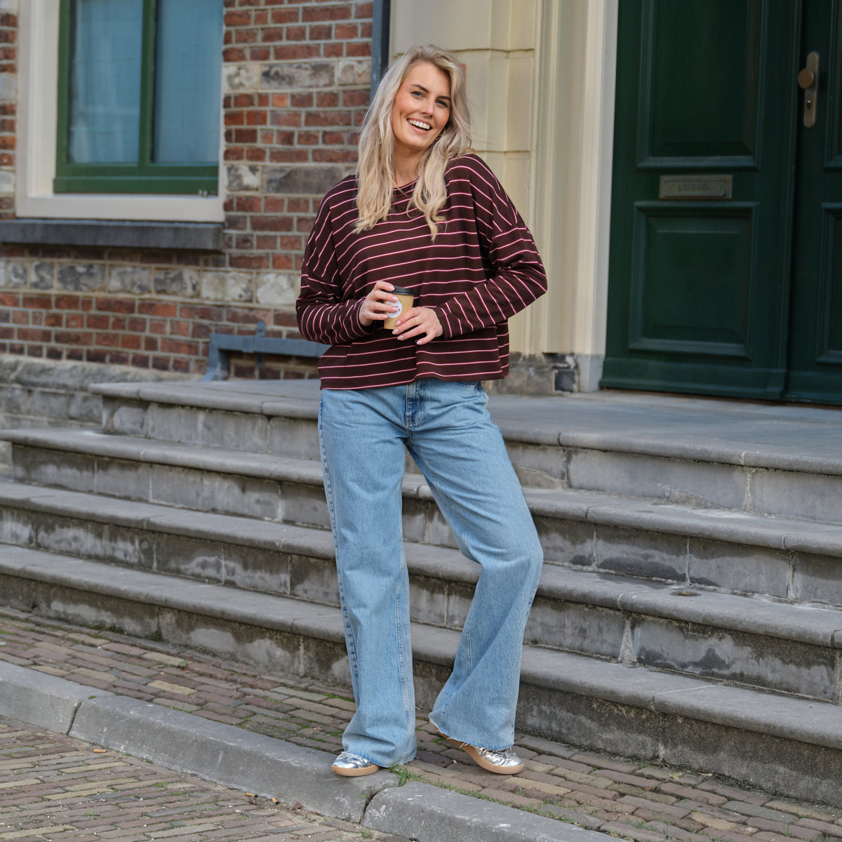 Deze Streep Top is een cropped essential die comfort en stijl moeiteloos combineert. De top heeft een tijdloos horizontaal streepdessin in een warme combinatie van donkerbruin en zachtroze/beige. De wijde, oversized pasvorm, de ronde hals en de cropped lengte maken deze trui perfect om te combineren met een high-waist jeans.