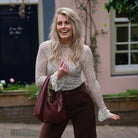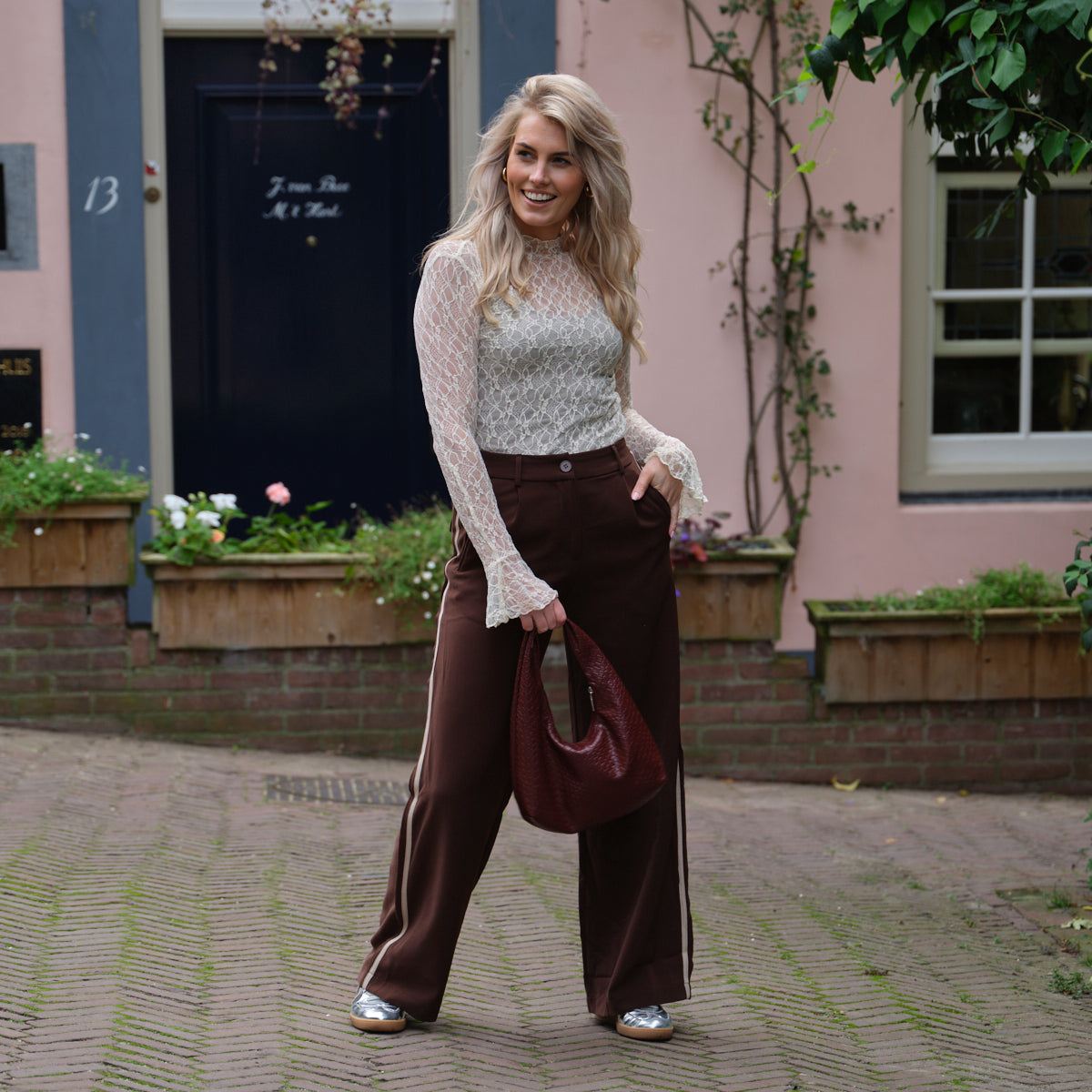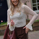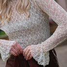 Geef je outfit een romantische en trendy twist met deze prachtige ecru kanten top. De top heeft een aansluitend model en is gemaakt van een semi-transparante kanten stof met een uniek patroon. De top heeft lange mouwen met een leuke uitlopende rand, wat zorgt voor een elegante look.