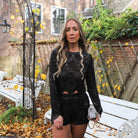 Deze Luce Top Paillet is een glamoureuze en opvallende toevoeging aan je feestelijke collectie. De top is gemaakt van transparante, zwarte mesh die rijkelijk is versierd met zwarte pailletten en kraaltjes in een prachtig geschulpte ('scallop') patroon.