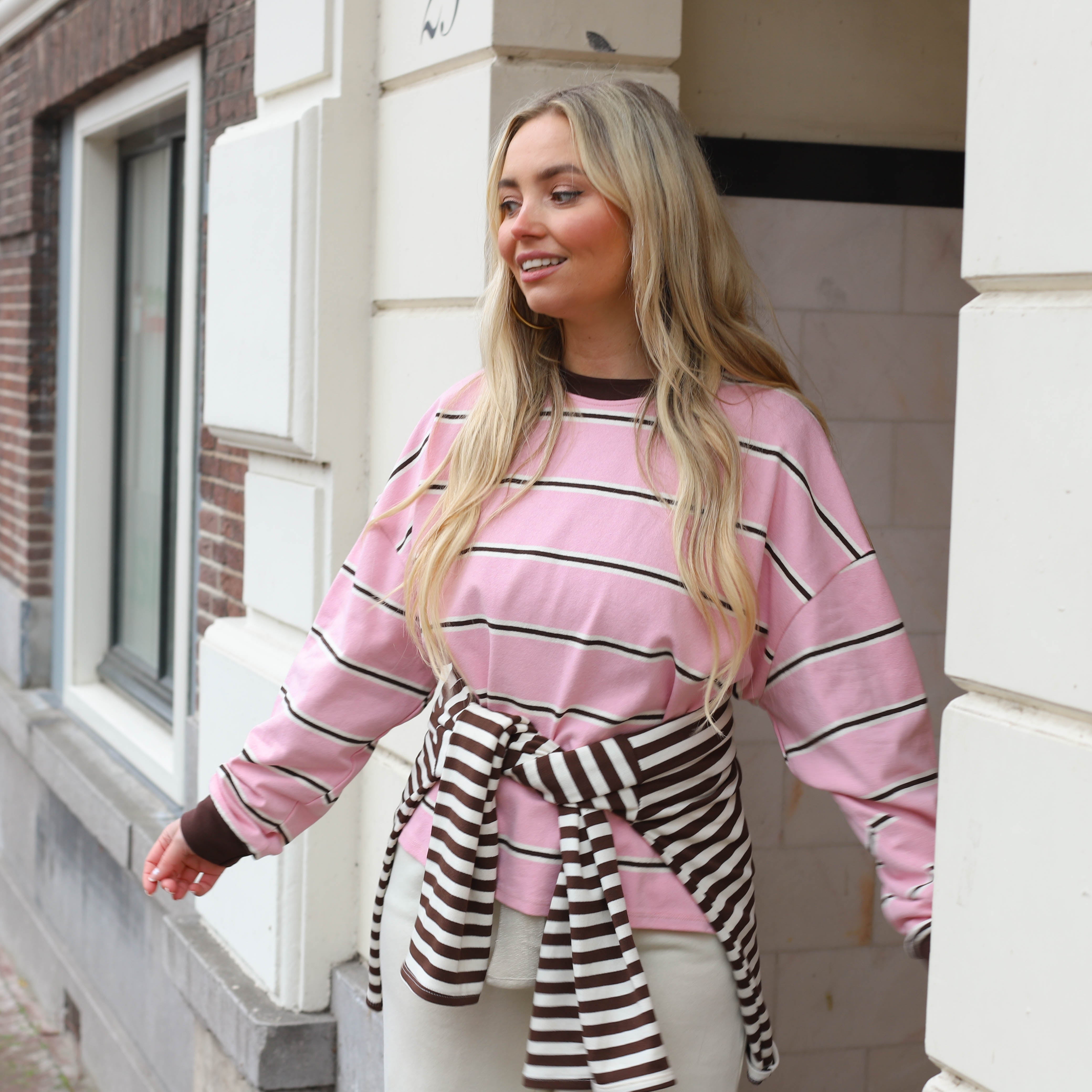 De top heeft een ruime, oversized pasvorm met een klassieke ronde hals afgewerkt met een bies en lange mouwen.