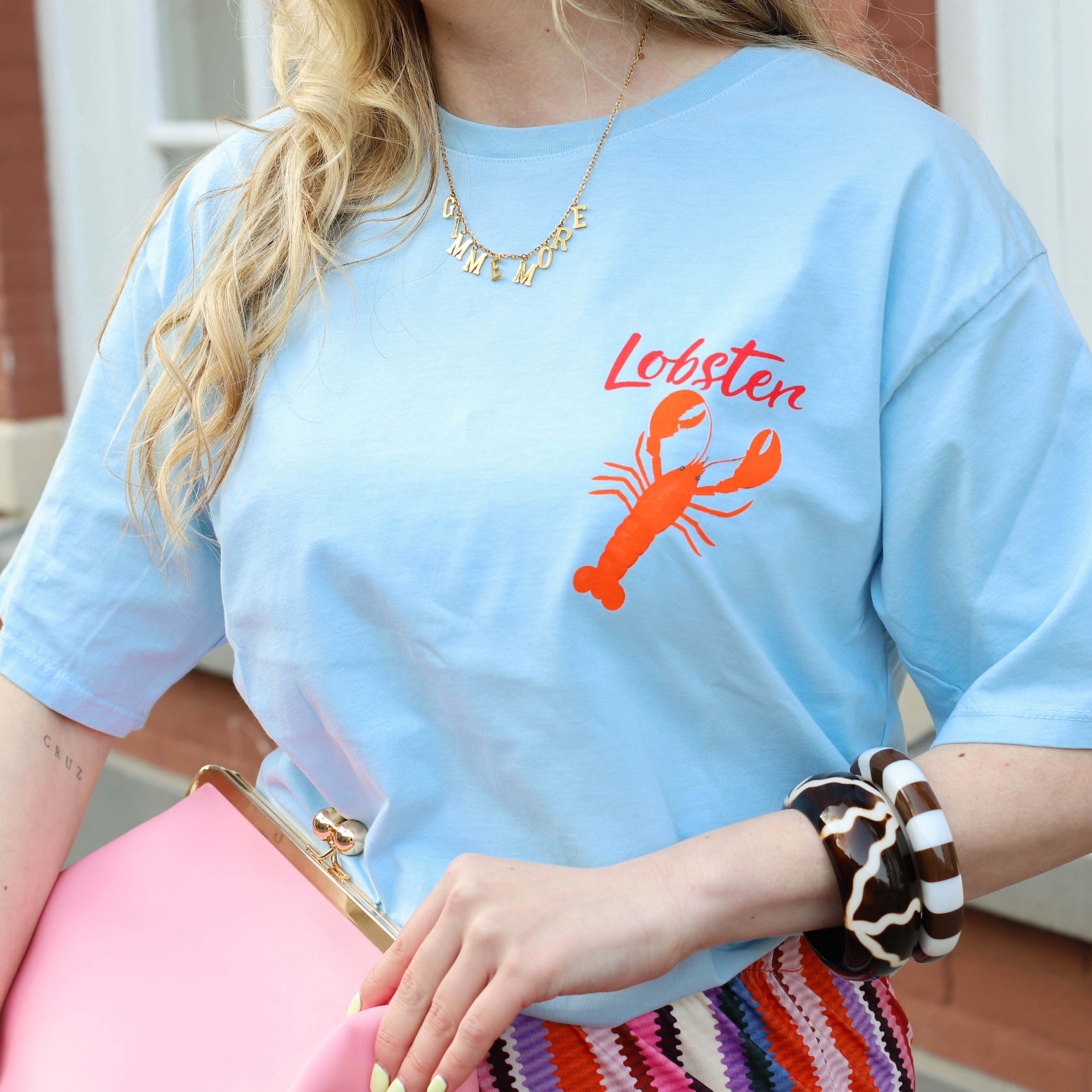 Dit T-shirt is een fris en zomers item met een speelse en minimalistische uitstraling. De zachte blauwe kleur geeft het shirt een lichte en warme look, terwijl de subtiele “Lobster” print met kreeftje op de borst zorgt voor een vrolijk en opvallend detail.