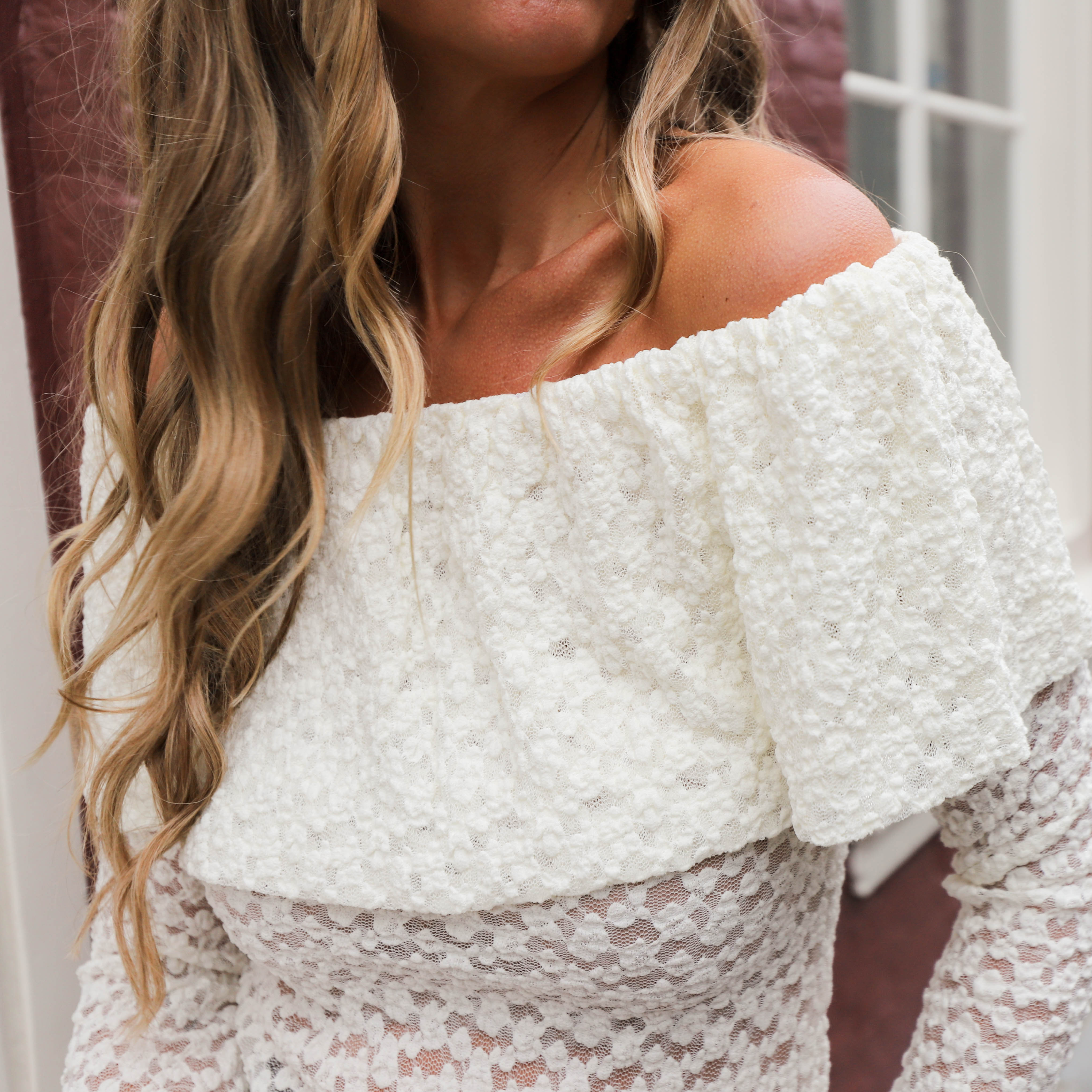 Het meest opvallende kenmerk is de wijde, elastische halslijn die off-shoulder gedragen wordt, met een grote, dubbele ruffle die de schouders flatteert. De top heeft een aansluitende pasvorm en lange mouwen.