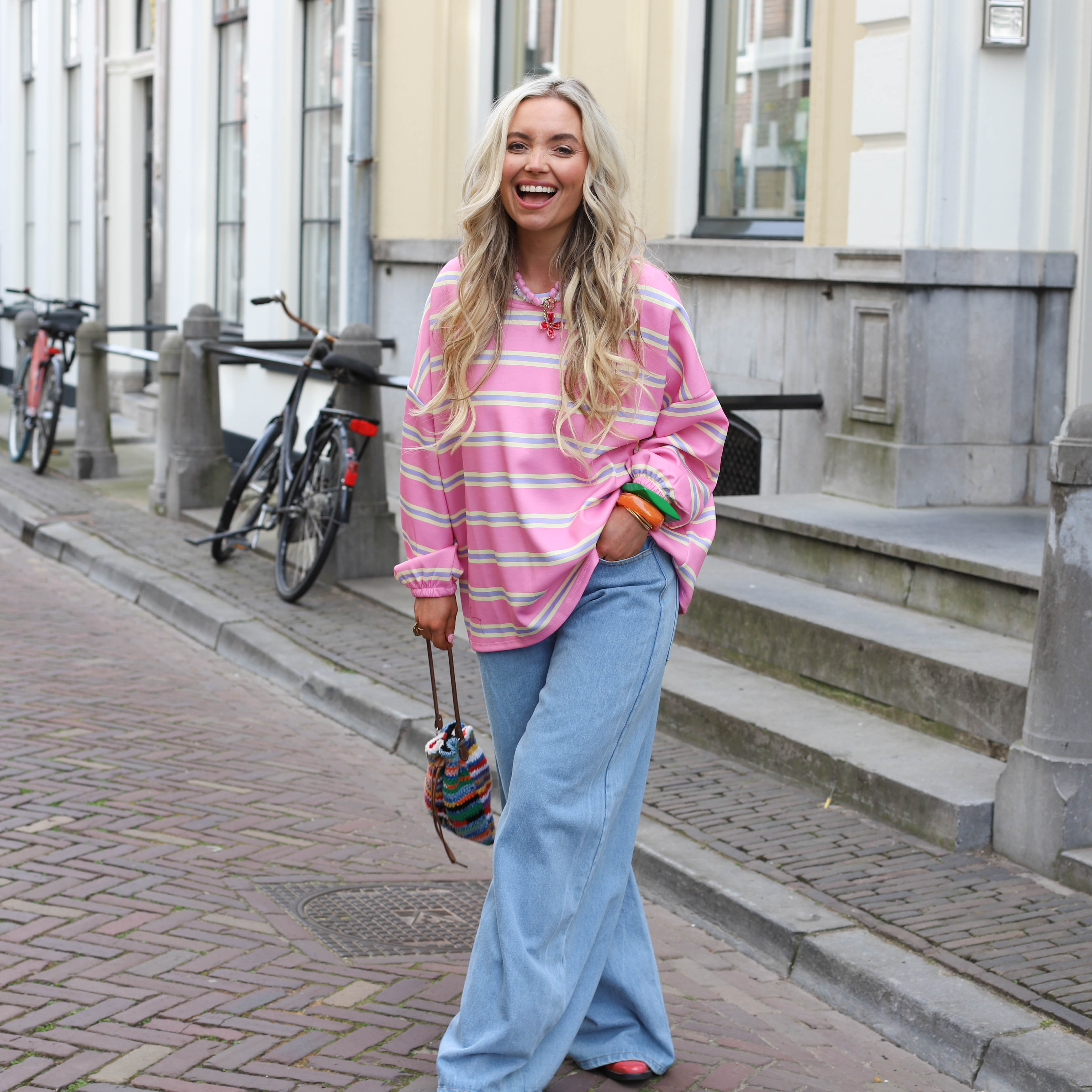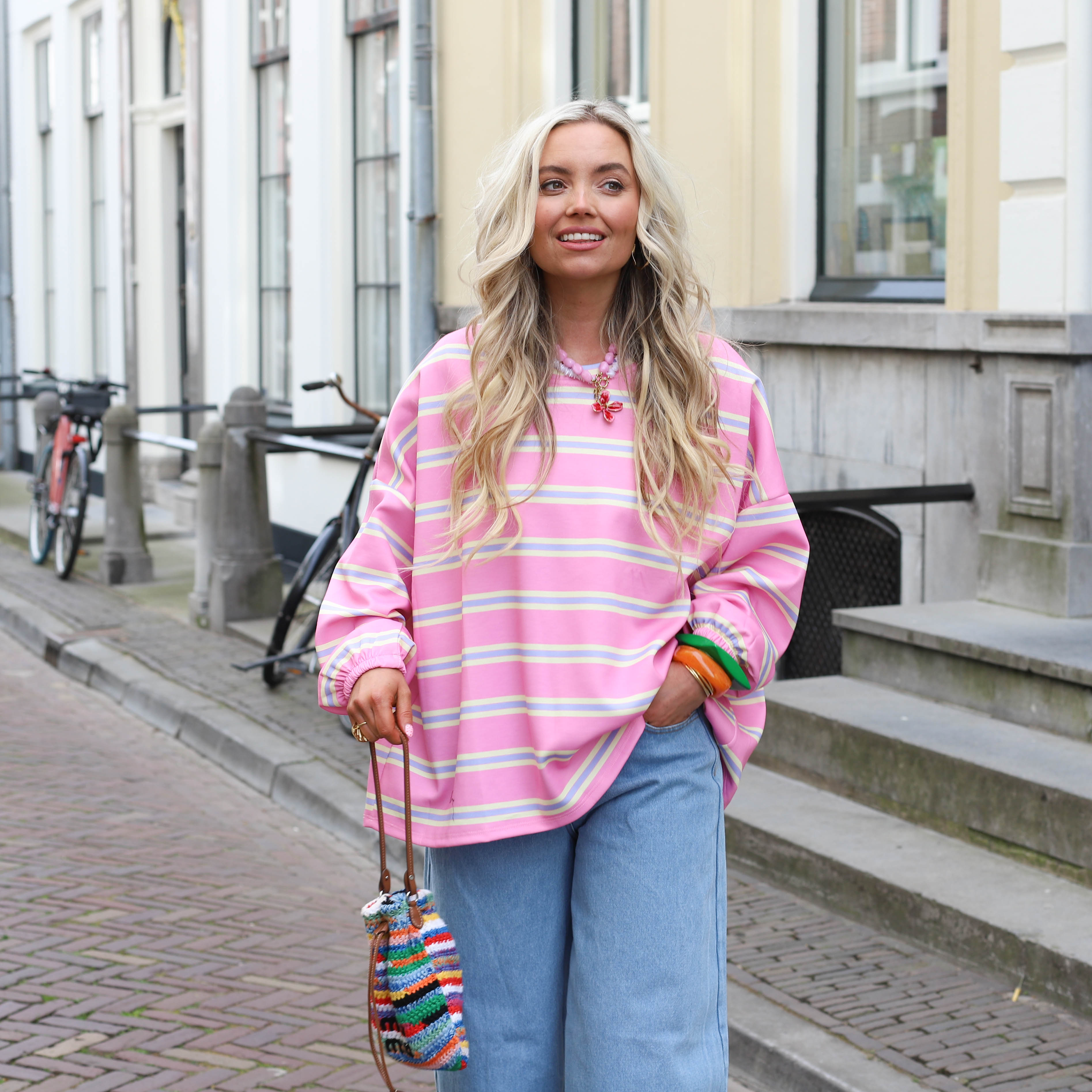 Vrolijke sweater met een speels streeppatroon. De zachte kleurencombinatie en comfortabele pasvorm maken dit item perfect voor een casual, maar opvallende look. Ideaal om je outfit net dat beetje extra kleur te geven.