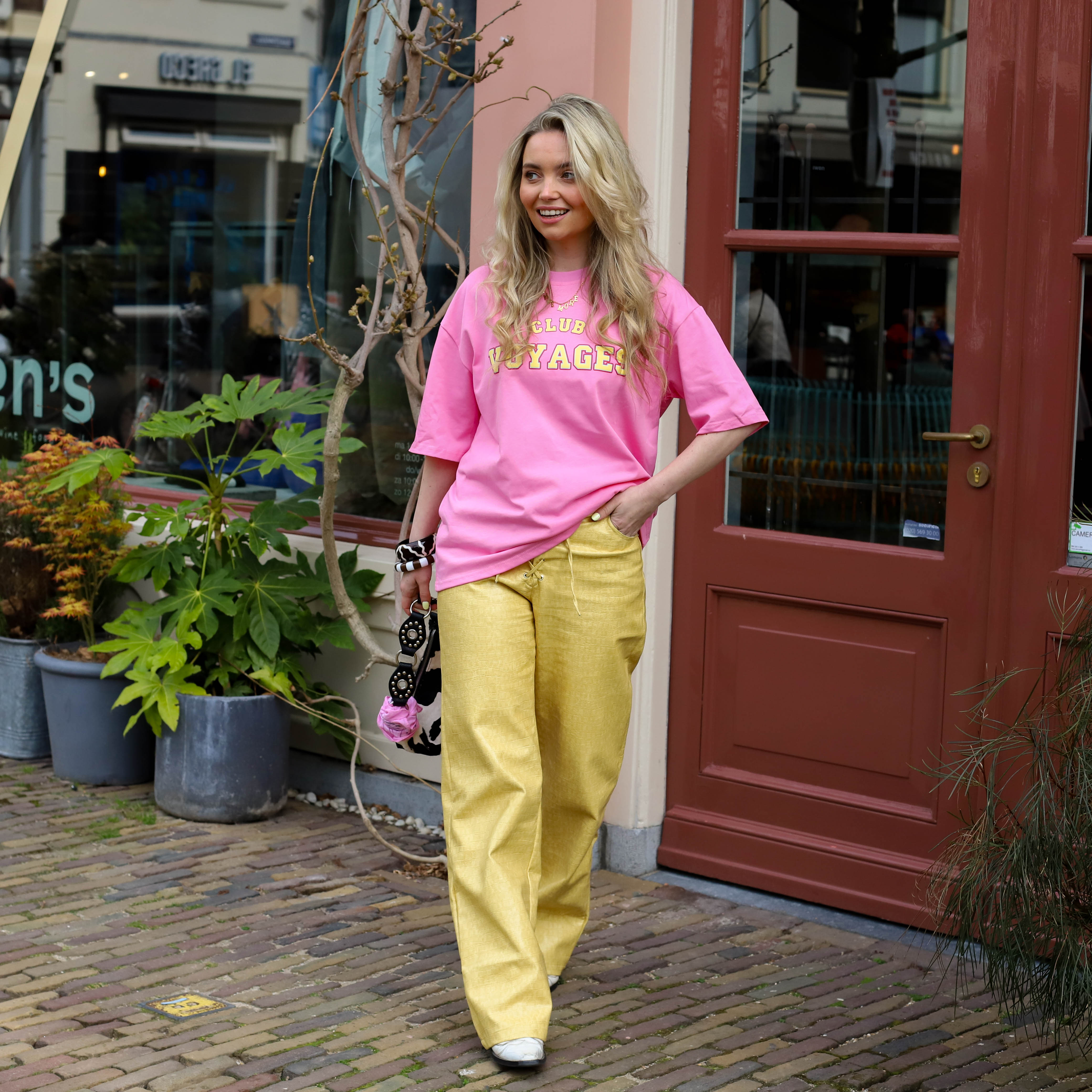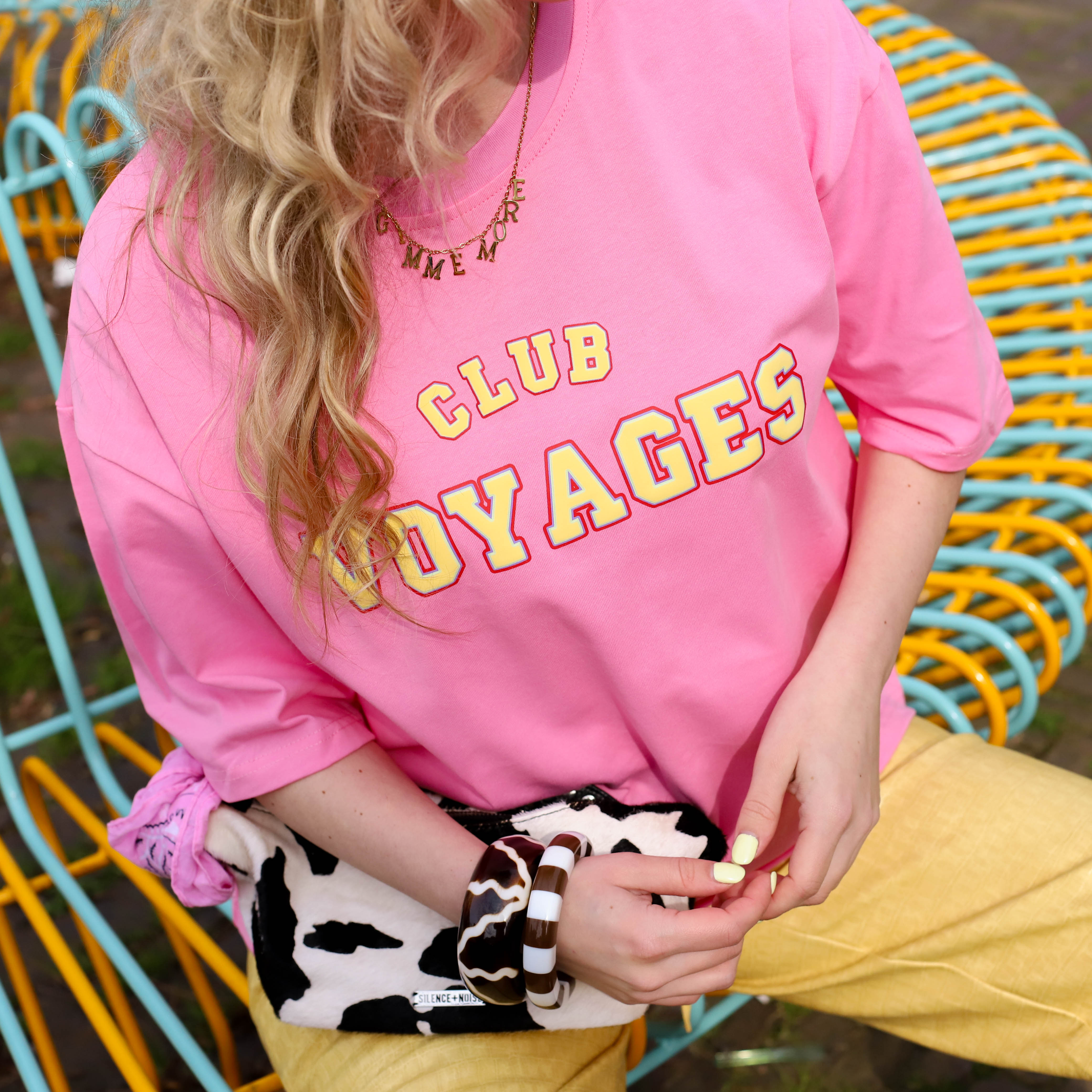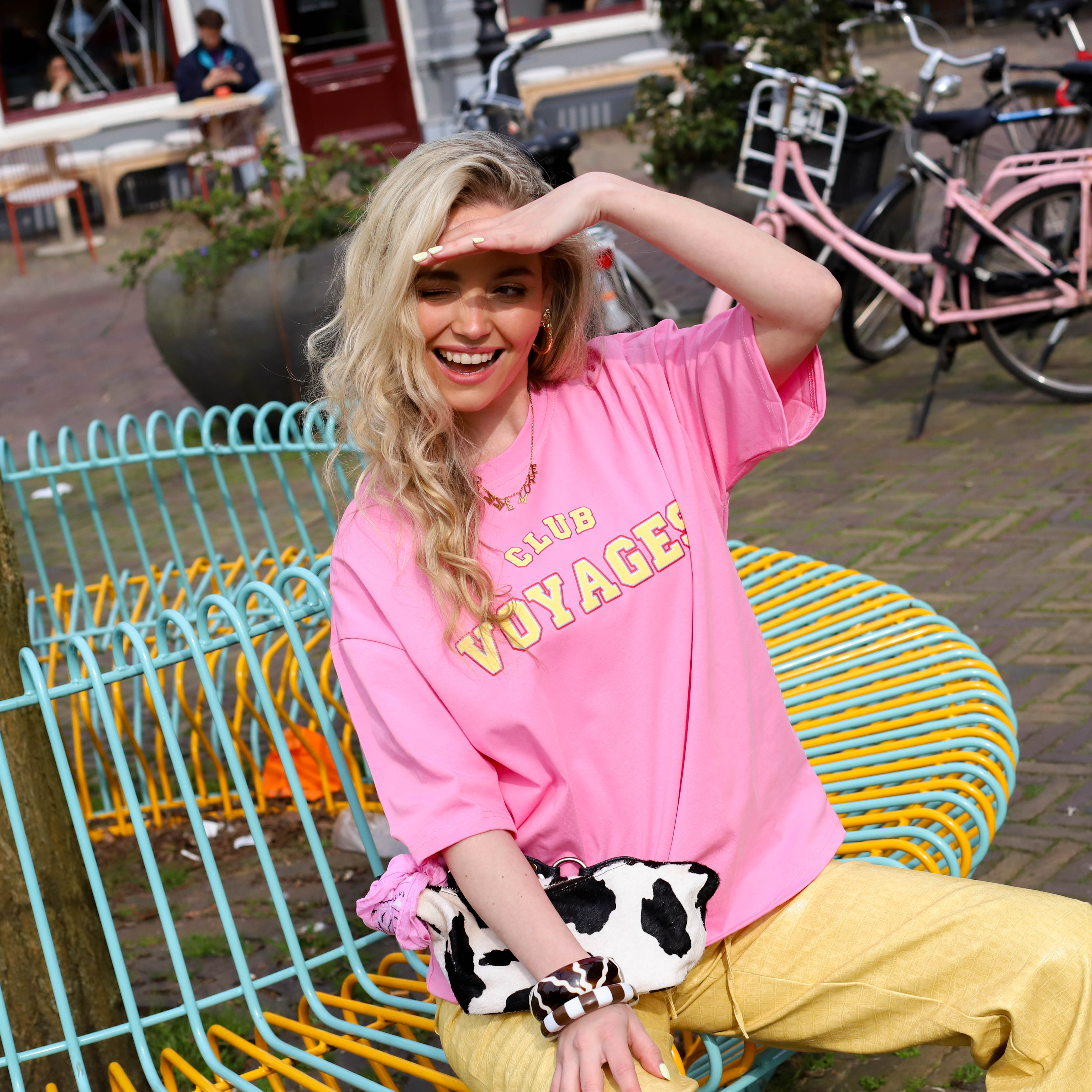 Dit roze T-shirt is een speels en opvallend item met een frisse en vrouwelijke uitstraling. De zachte roze kleur geeft het shirt een vrolijke en zomerse look, terwijl de “Club Voyages” print op de borst zorgt voor een trendy en sportief detail.