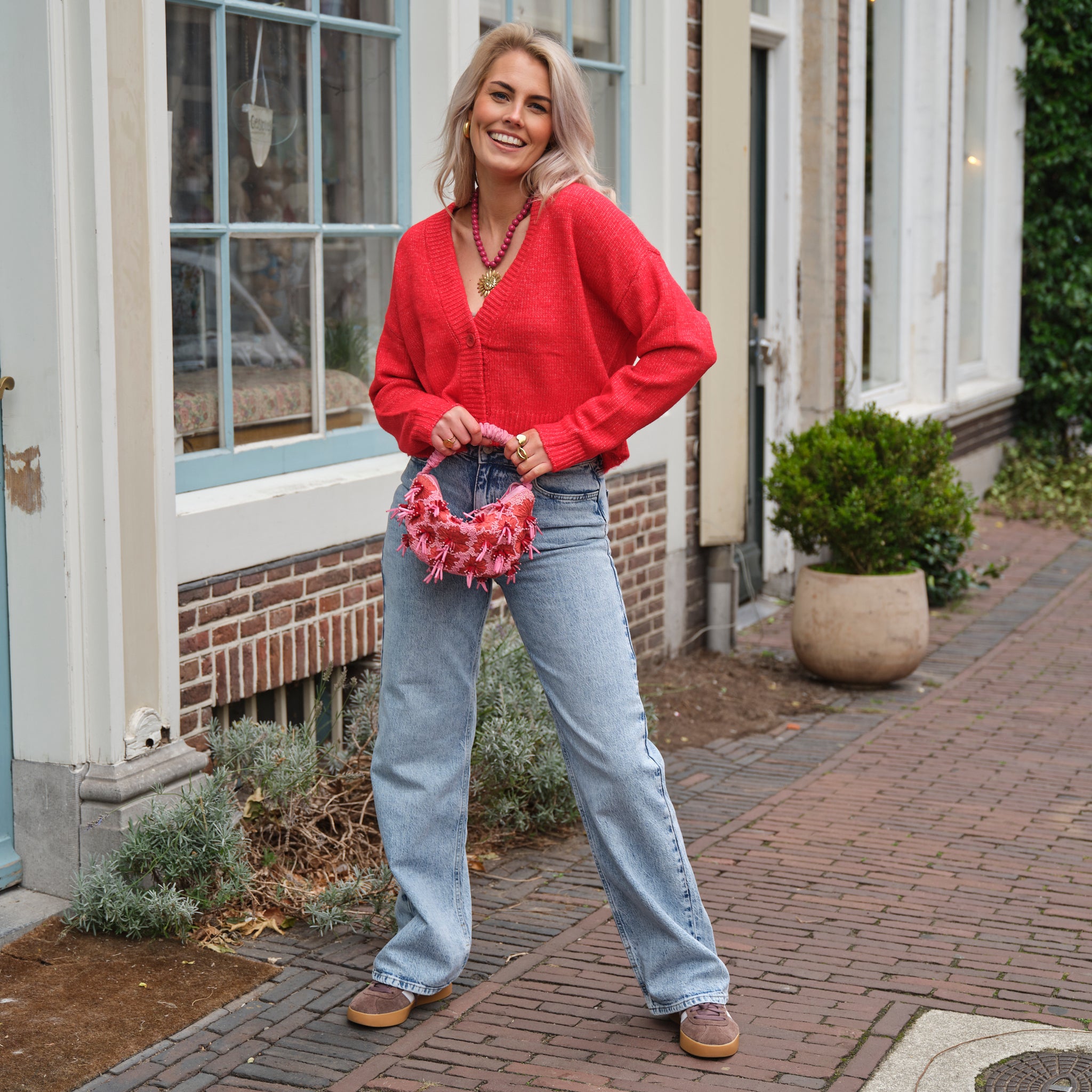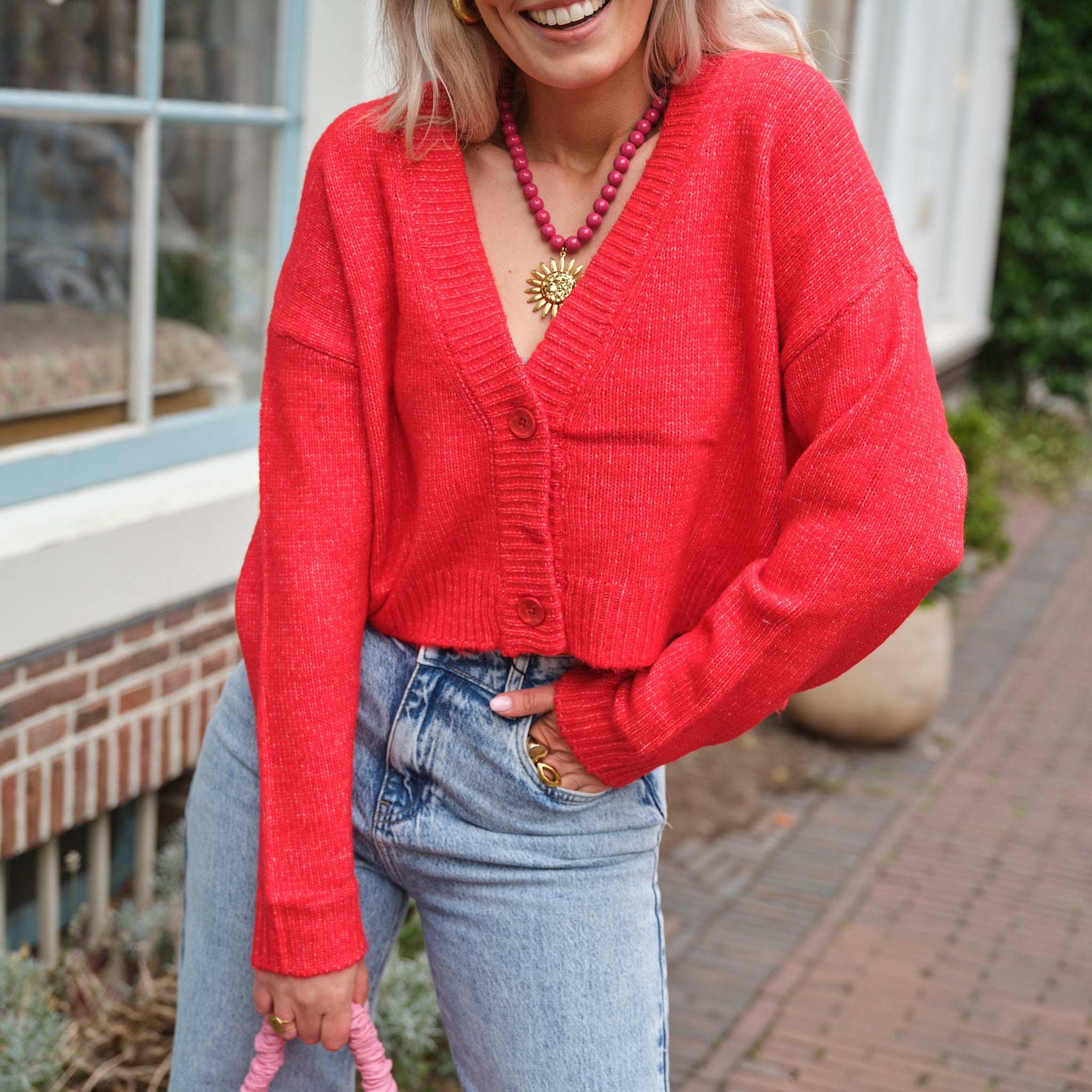 Wave vest strikjes roze rood