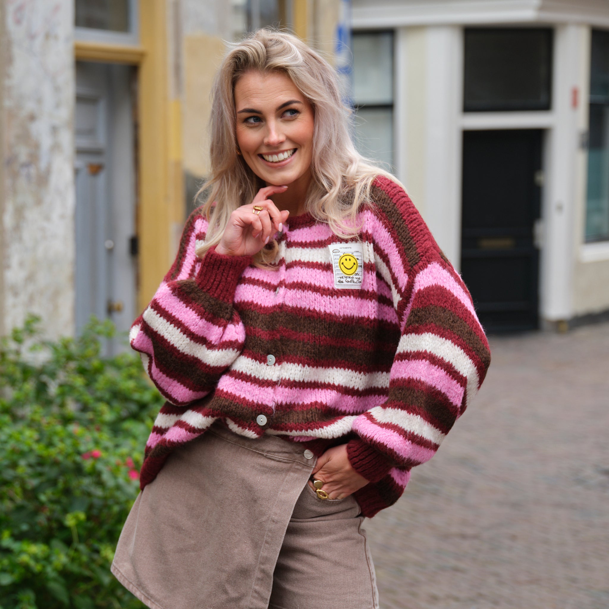 Smiley streep vest grijs roze