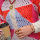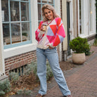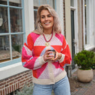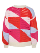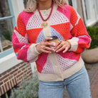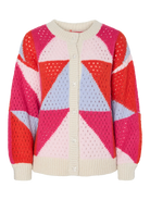Dit pc Jane Le Oneck Knit Cardigan is een vrolijke, kleurrijke blikvanger. Het vest is gebreid met een uniek, geometrisch blokpatroon in verschillende tinten, waaronder felroze, oranje, rood en lichtblauw, gecombineerd met een crèmekleurige bies en kraag. Het ajourbreisel geeft een lichte, speelse textuur, perfect voor het tussenseizoen. De ronde halslijn en de knoopsluiting maken dit vest een charmante toevoeging aan elke outfit.