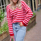 Het Joy streep vest is een vrolijke, oversized toevoeging die direct kleur geeft aan je outfit. Dit heerlijk zachte vest is gebreid in een opvallend roze met rood streepdessin en heeft een flatterende V-hals en een knoopsluiting. De wijde mouwen en de comfortabele pasvorm maken dit vest perfect om als een warm vest te dragen of gesloten als een trui. Combineer dit vest met een eenvoudige zwarte broek om de felle kleuren eruit te laten springen, of draag hem over een jurk voor een warme, speelse look.