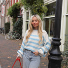 Mooie ecrukleurige trui met blauwe dunne strepen. De trui heeft een ronde hals en is oversized. Combineer met een jeans.