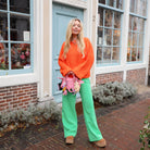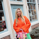 Mooie oversized trui met een ronde hals. De trui is oversized en heeft een knalkleur oranje. De trui heeft een grof ribbelmotiefje en staat leuk met een groene broek.