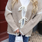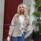 Mooi vestje in het beige met witte stiksels. Het vestje heeft strikken aan de voorkant. Het vestje heeft een oversized model en staat leuk met een jeans.