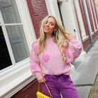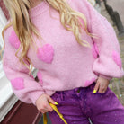 Deze schattige, roze trui met roze hartjes is perfect voor de dagen waarop je er lief en trendy uit wilt zien. De trui is gebreid in een zachtroze kleur en versierd met roze hartjes. De trui heeft een comfortabele pasvorm en is gemaakt van een zachte mix van materialen. Perfect voor een casual dagje uit of een avondje op de bank.