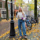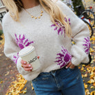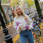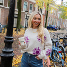 Mooie ecrukleurige trui met paarse gebreide details in de vorm van een zon. De trui heeft een ronde hals en staat leuk met een jeans.
