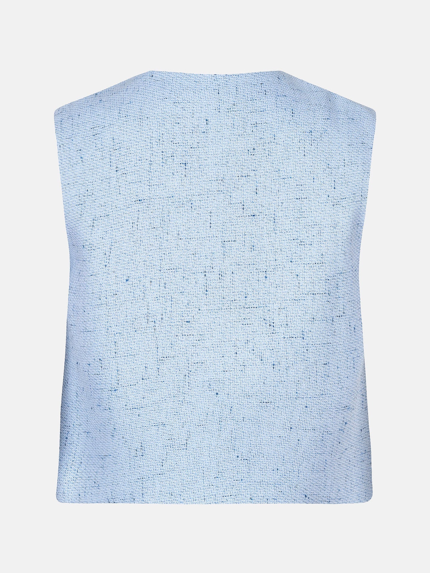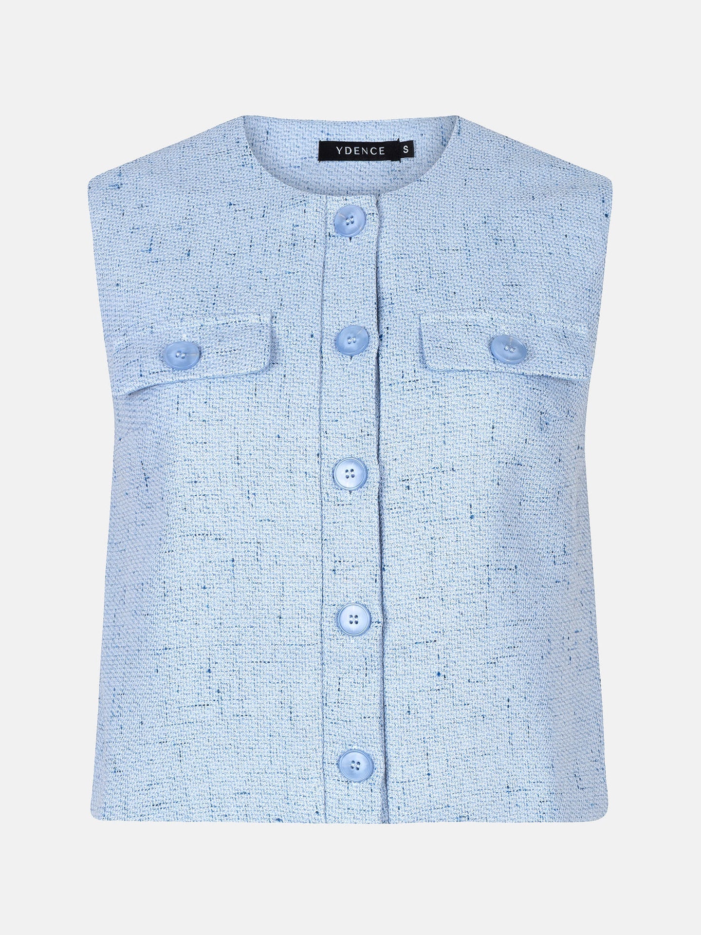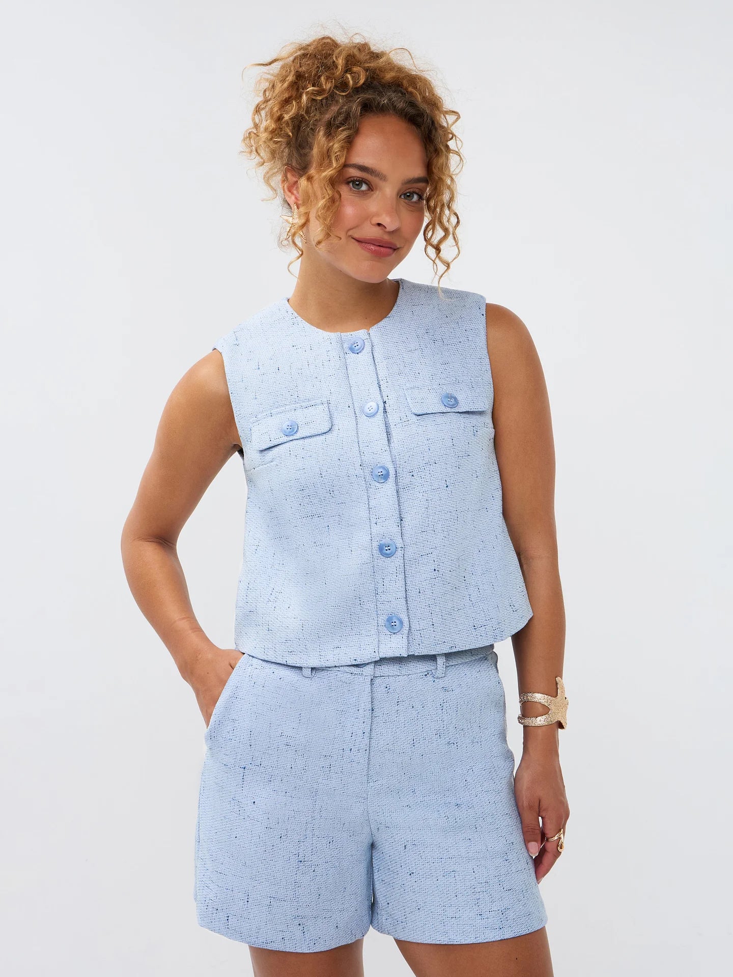 Gilet Amanda is een chique en trendy toevoeging aan je garderobe. Dit gilet heeft een rechte, cropped pasvorm en is voorzien van een doorlopende knoopsluiting aan de voorkant. De opgestikte borstzakken met klep geven het gilet een speelse en eigentijdse look. De luxe tweedstof maakt dit item perfect voor zowel casual als formele gelegenheden. De lengtemaat van Gilet Amanda is 49cm bij een maat S.