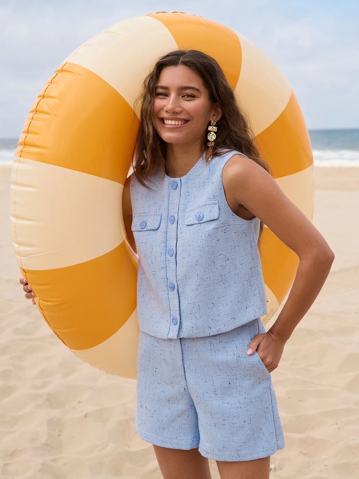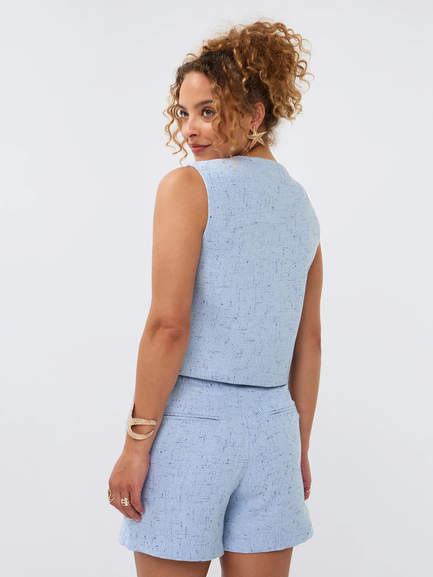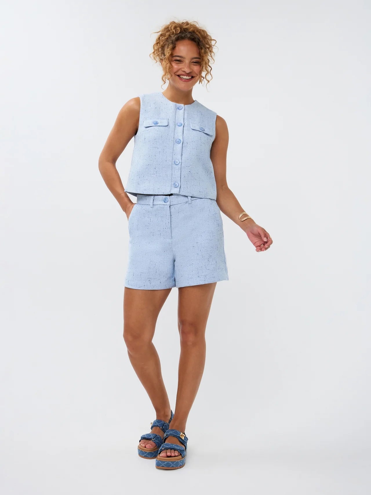 Gilet Amanda is een chique en trendy toevoeging aan je garderobe. Dit gilet heeft een rechte, cropped pasvorm en is voorzien van een doorlopende knoopsluiting aan de voorkant. De opgestikte borstzakken met klep geven het gilet een speelse en eigentijdse look. De luxe tweedstof maakt dit item perfect voor zowel casual als formele gelegenheden. De lengtemaat van Gilet Amanda is 49cm bij een maat S.