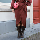 Skirt Barbara is een vrouwelijke en stijlvolle wrapskirt die elegantie uitstraalt. Deze rok heeft een flatterend overslagmodel met een sierlijke knoopdetail aan de zijkant. De subtiel glanzende stof met een lichte textuur geeft de rok een luxe uitstraling.