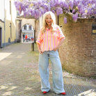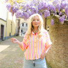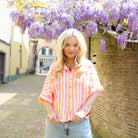 Breng een frisse wind in je outfit met deze vrolijke blouse! De opvallende strepen in heldere fluorkleuren geven een speelse en zomerse uitstraling. Perfect om je dag net wat zonniger te maken.
