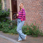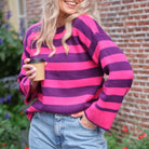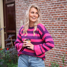 Deze Flore Streep Trui is een zachte en opvallende trui die je casual look direct kleur geeft. De trui heeft een klassiek horizontaal streepdessin in een levendige combinatie van fuchsia en paars. De fijne knit, de ronde hals en de comfortabele, oversized pasvorm zorgen ervoor dat dit een heerlijke trui is om te dragen. Style 'm met een donkere jeans of een leren broek om de felle kleuren eruit te laten springen.