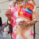 Deze unieke set bestaat uit een kortemouw overhemd en een bijpassend shortje, beiden versierd met een opvallende print van sardineblikjes en zeesterren in roze, oranje en beige tinten. De lichte en luchtige stof maakt deze set perfect voor warme dagen en creëert een speelse, casual look. Het shortje heeft een elastische tailleband voor extra comfort en een korte pasvorm.