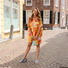 Deze complete tweedelige set, bestaande uit een oversized overhemd en een bijpassende short, is de perfecte keuze voor een stijlvolle en comfortabele zomer. Het kleurrijke design met zonnemotieven, krabben, palmbomen en Griekse patronen in geel, oranje en paars, straalt pure zomerse vibes uit.