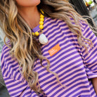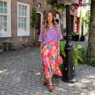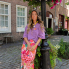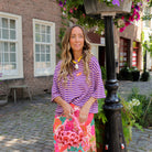 Dit casual 'Patch streep shirt aubergine roze' is een comfortabel en stijlvol shirt met een klassiek gestreept patroon. Het shirt heeft horizontale strepen in aubergine en roze, met een opvallende roze boord bij de hals en een klein geel labeltje op de borst, wat zorgt voor een speelse touch. De 3/4 mouwen en de losvallende pasvorm maken dit shirt ideaal voor een relaxte look.