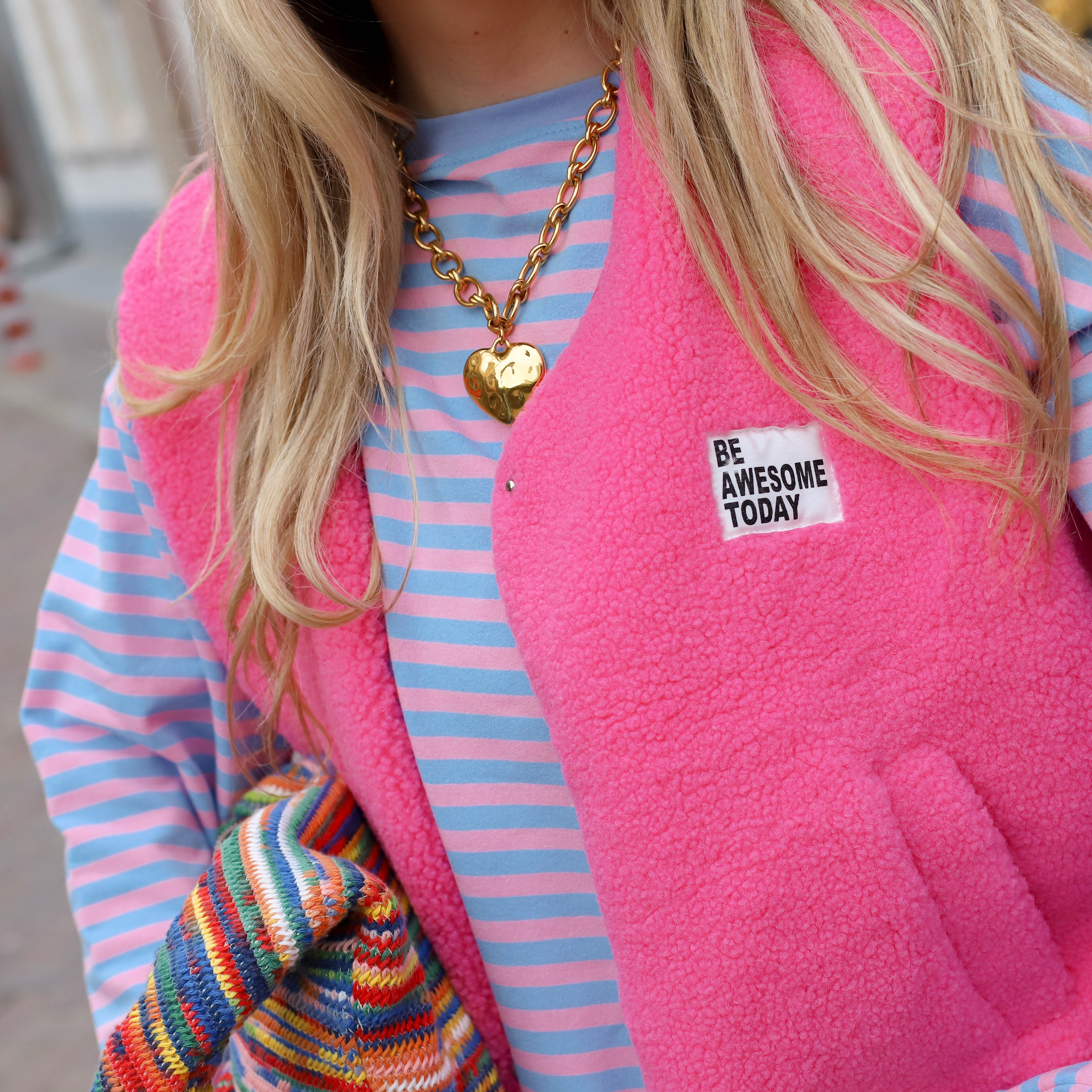 Dit Teddy Gilet Be Awesome Today is de ultieme knusse toevoeging aan je garderobe. Het gilet heeft een heerlijk zachte teddy-structuur en is voorzien van een subtiele "Be Awesome Today" patch op de borst voor een positieve, on-trend uitstraling. Dankzij de handige drukknopen en de relaxte pasvorm creëer je moeiteloos een gelaagde look die zowel comfortabel als fashionable is.