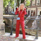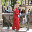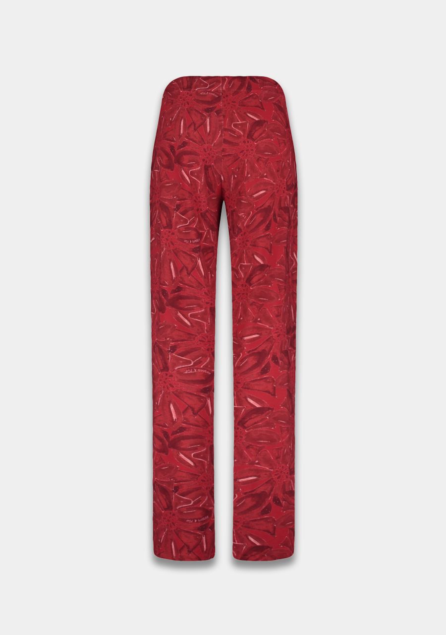 De JANE pants in RUBY RED FLOWER is een flared stretchbroek met een levendige rode bloemenprint. Aansluitend van boven en wijder naar onder. Combineer met de JANE top voor een power set.