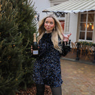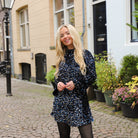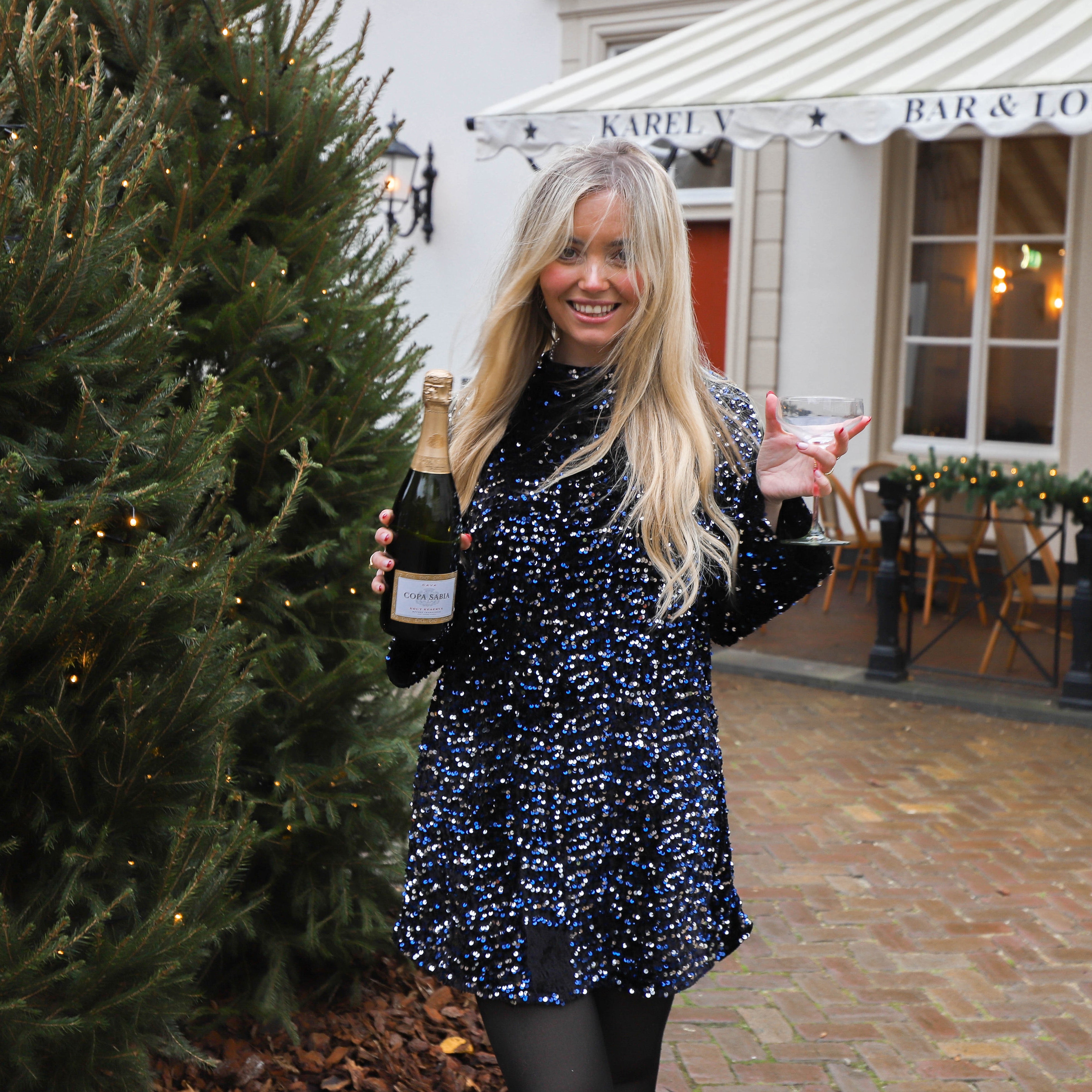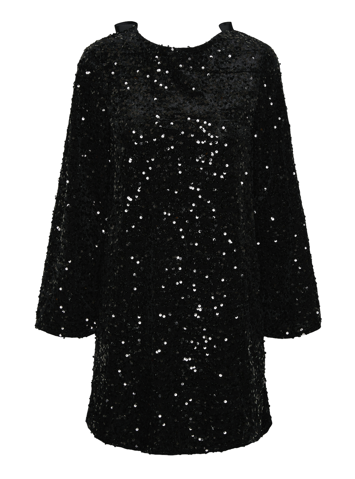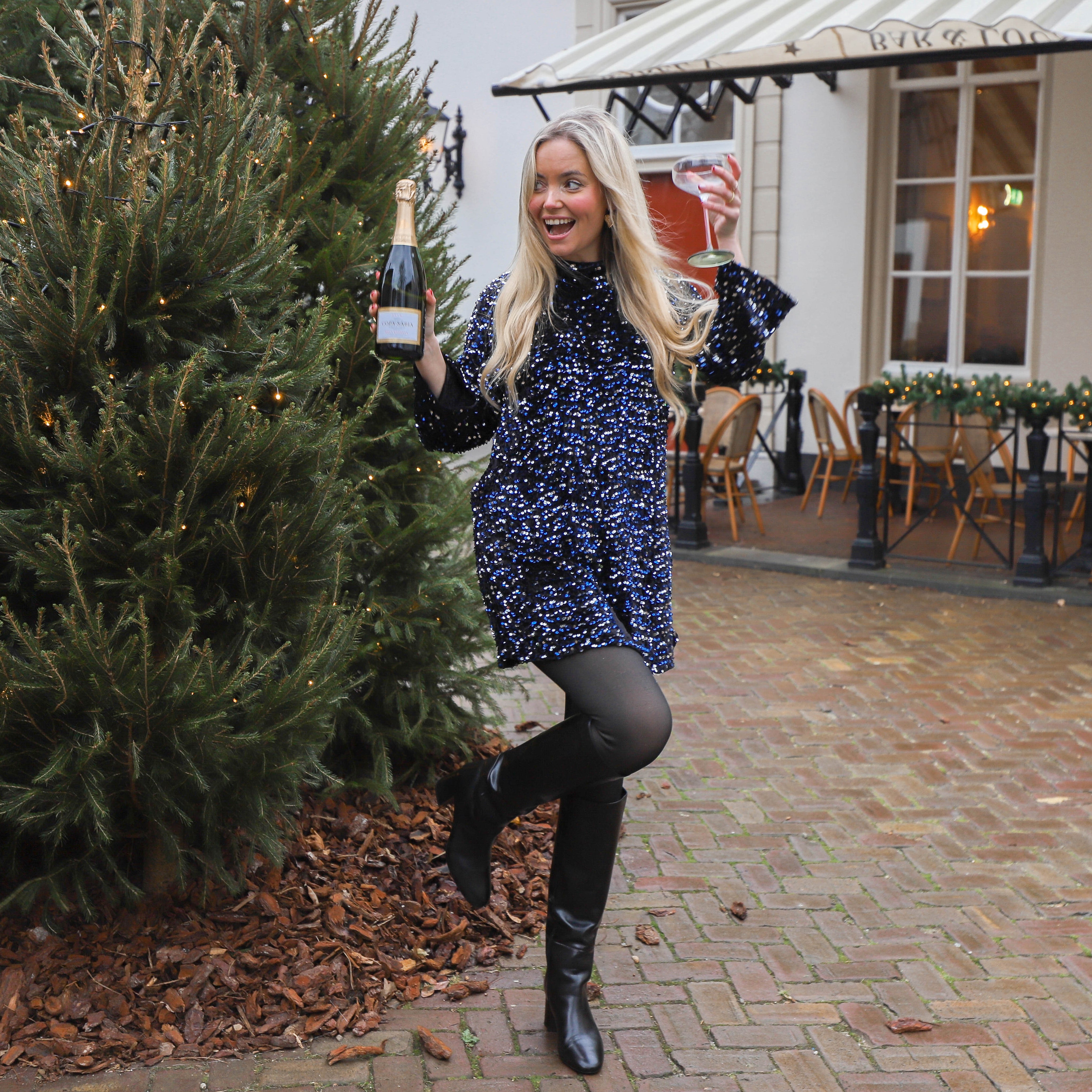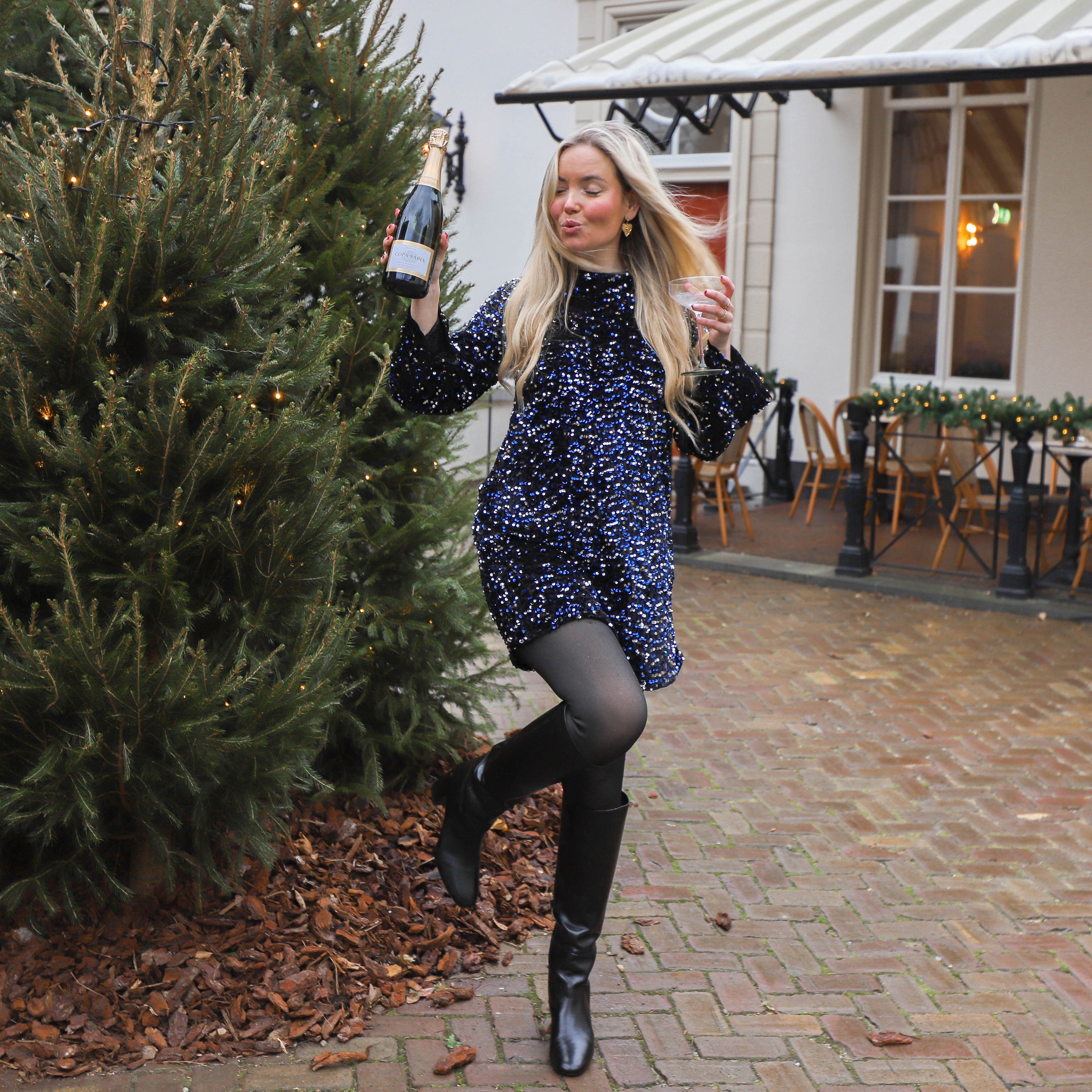 Wunderschönes schwarz-blau-silbernes Kleid mit Pailletten. Das Kleid hat eine A-Linie und lange Ärmel. Perfekt für die Feiertage!