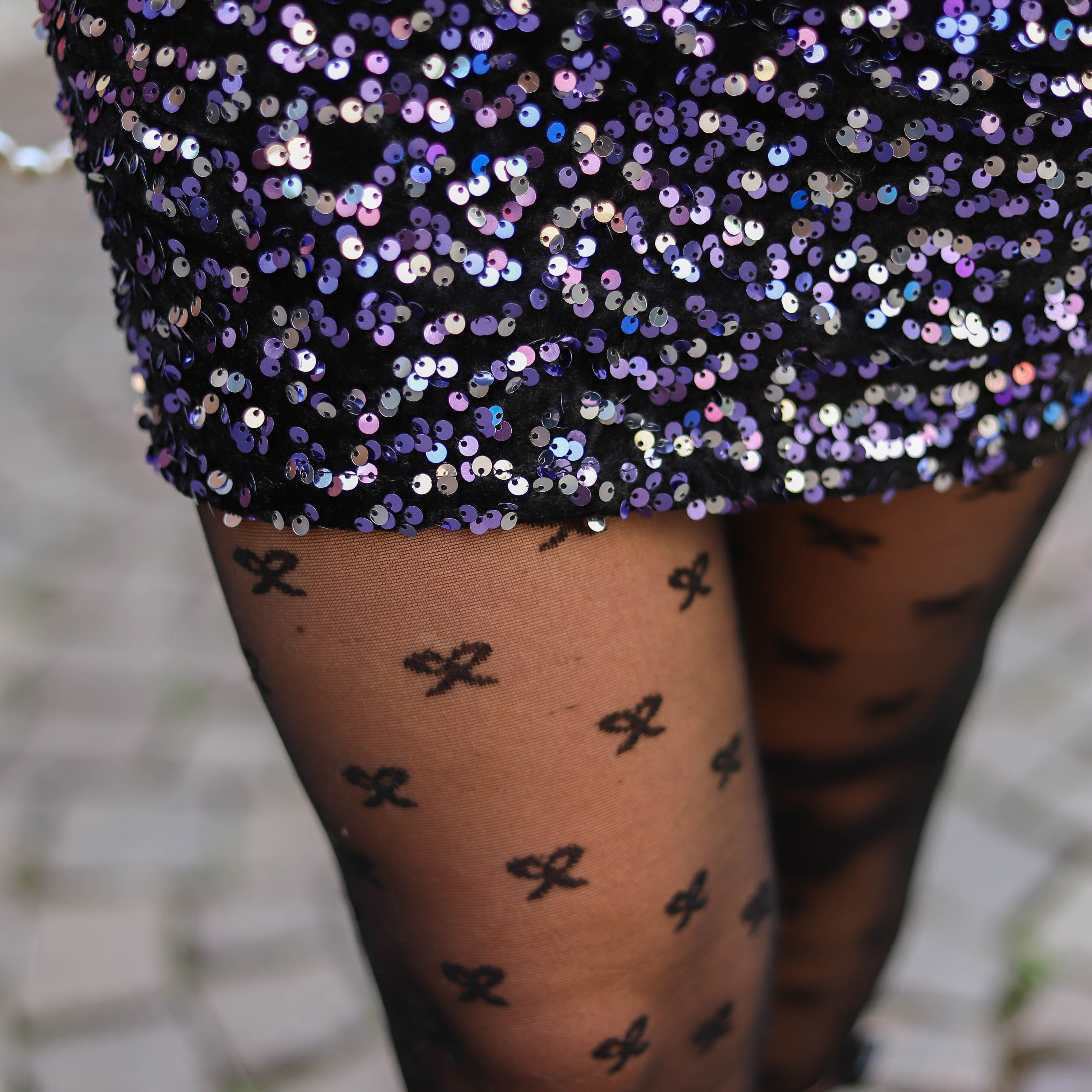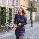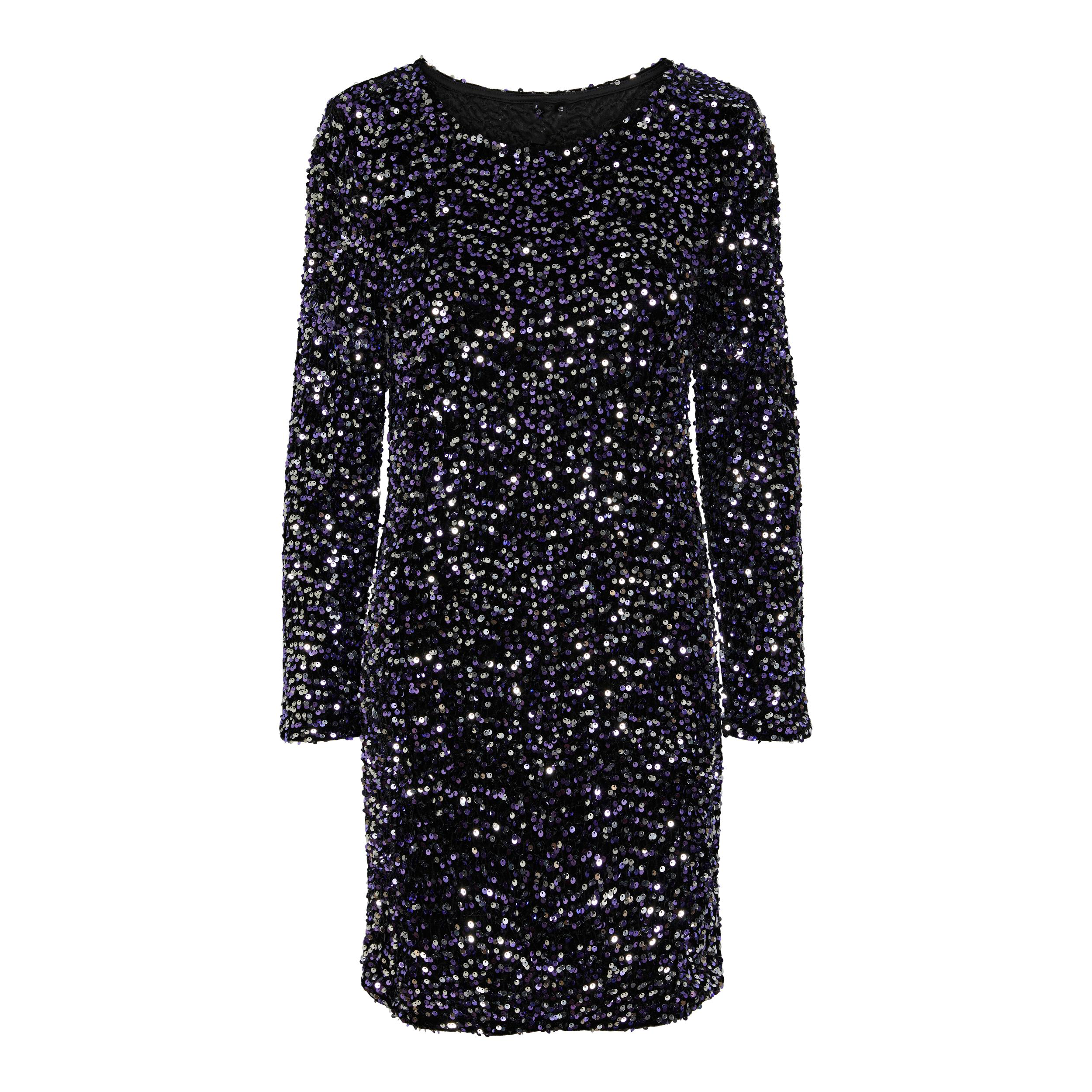 Wunderschönes Paillettenkleid in Schwarz-Lila. Das Kleid hat eine enge Passform und ist ideal für eine Party. Ergänzen Sie es mit Stiefeln oder Absätzen.