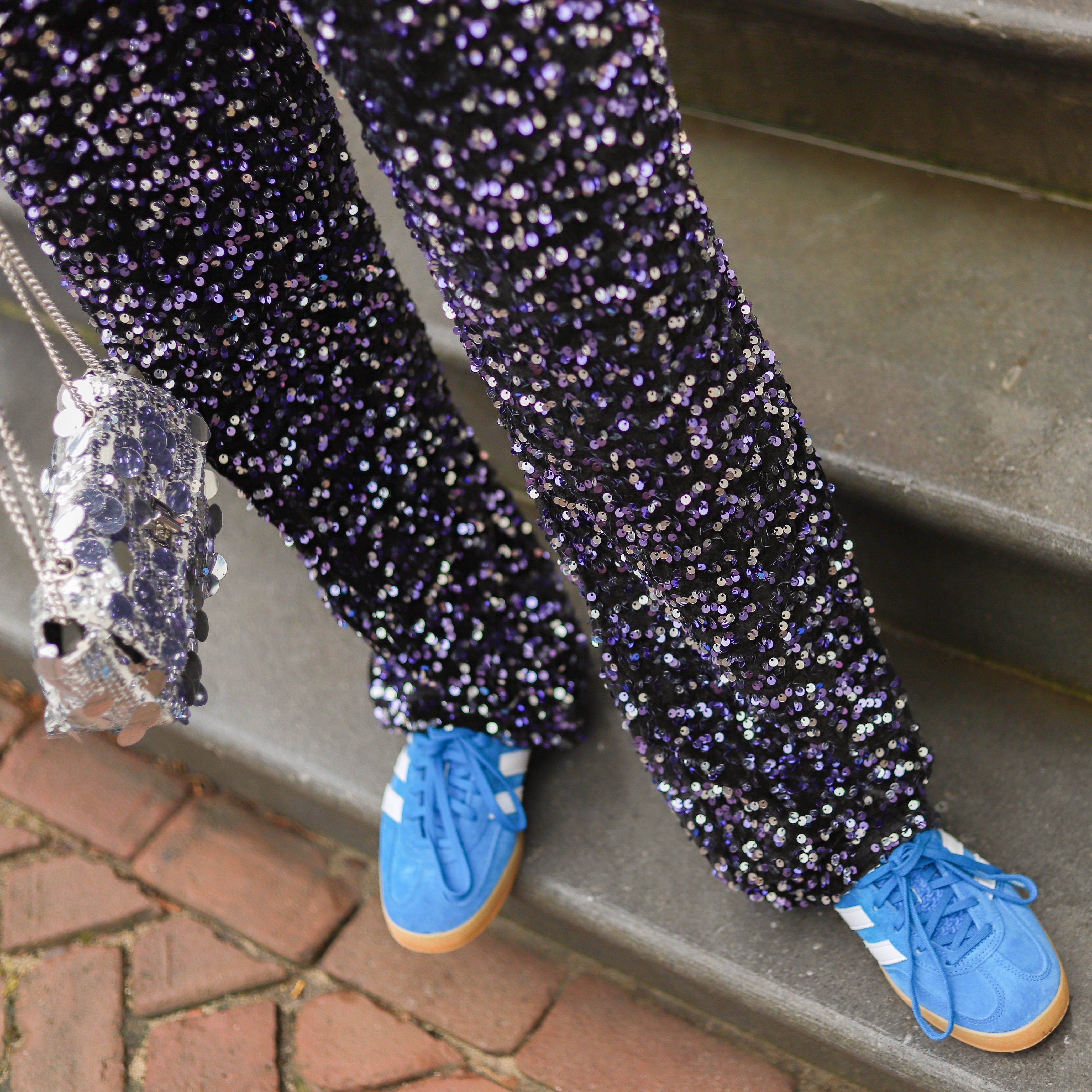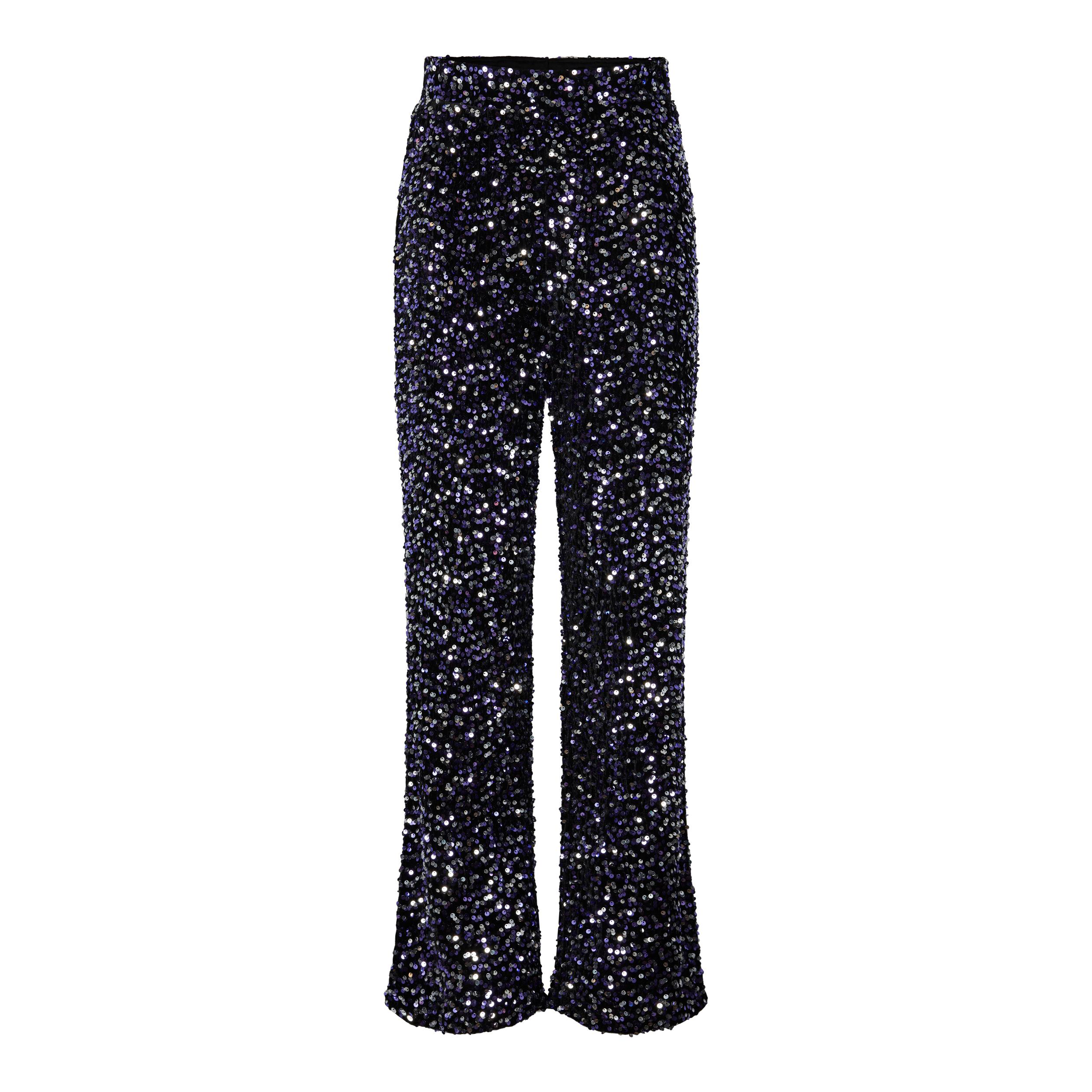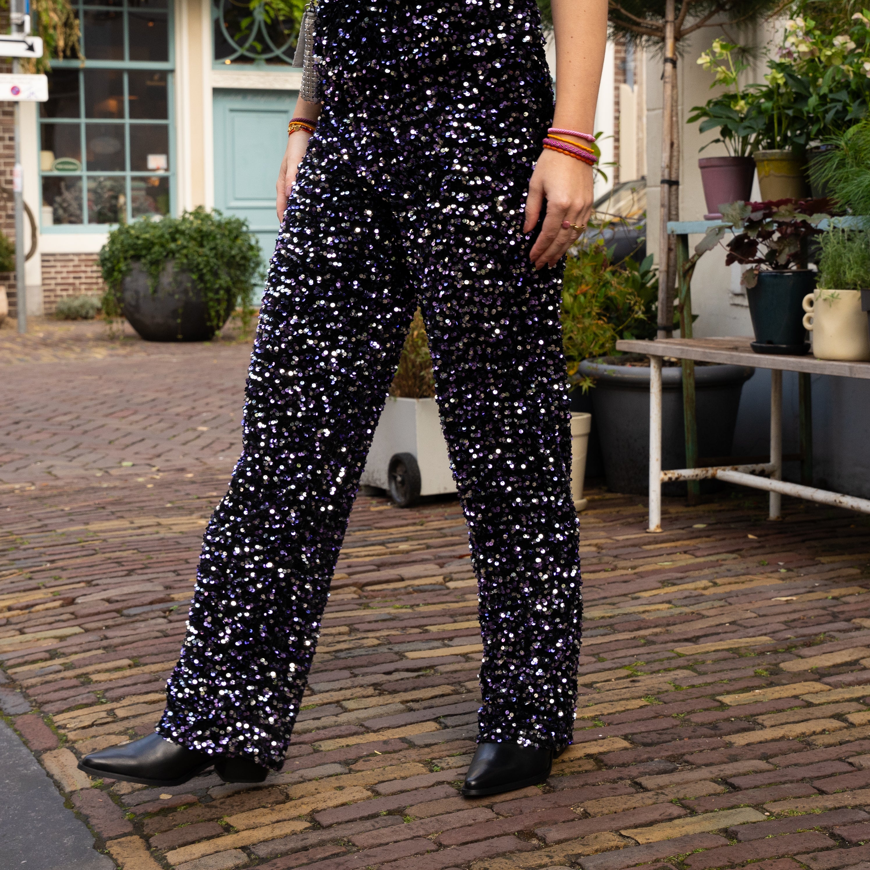 Lange Hose mit Pailletten in Schwarz und Lila: ideal für eine Party. Kombinieren Sie es mit dem passenden Oberteil oder einem anderen schönen Pullover oder Oberteil.