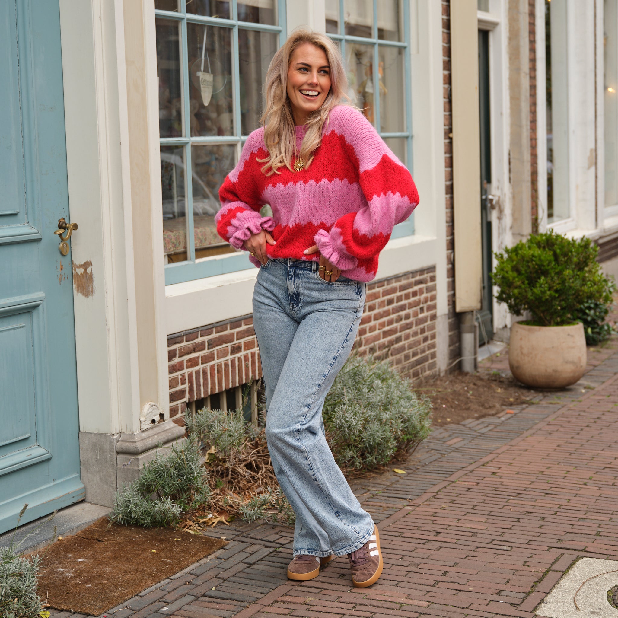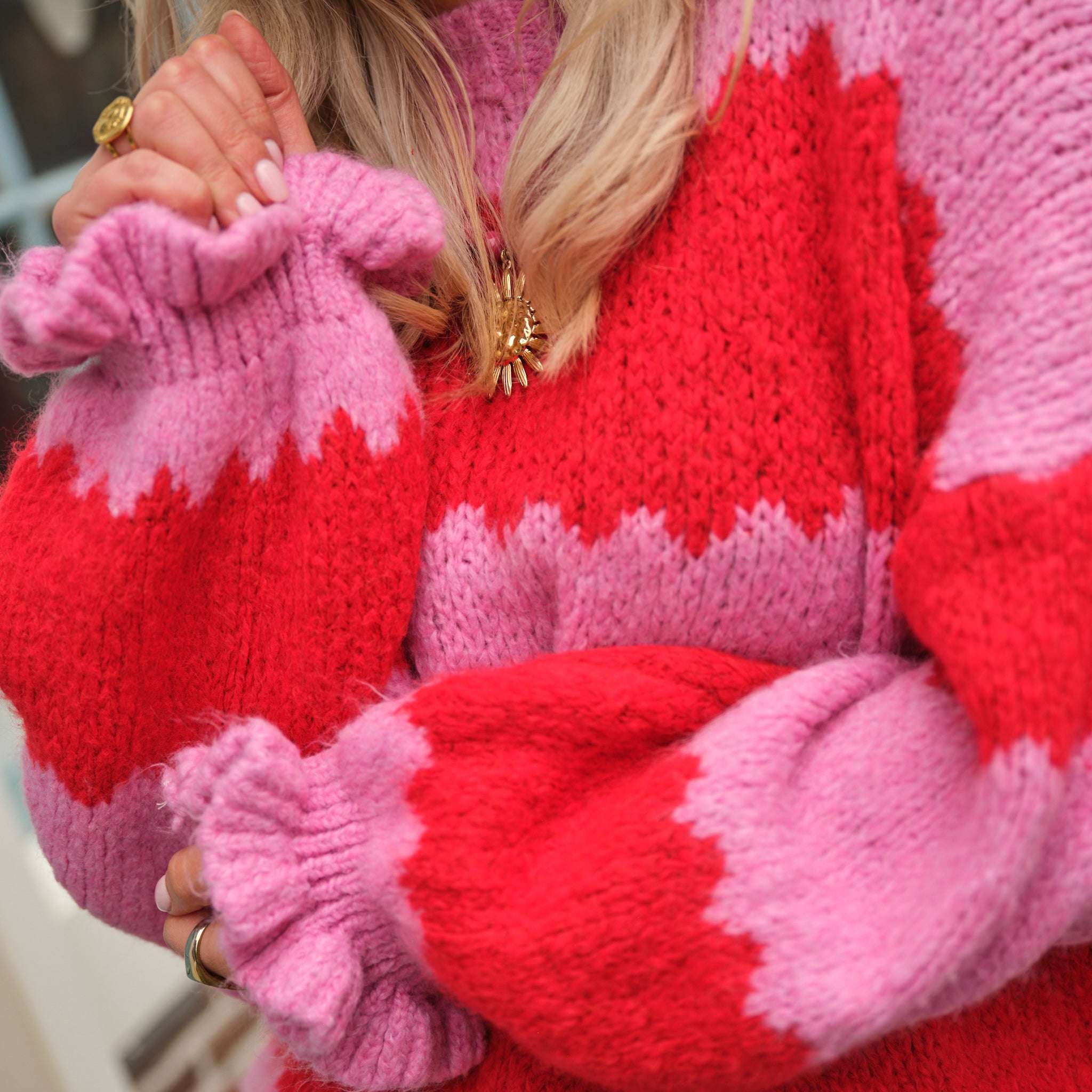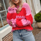 Deze vrolijke Gebreide Streep Trui is een zachte en kleurrijke statement trui. De trui is gebreid in een opvallend blokstreepdessin dat felrood afwisselt met zachtroze, wat zorgt voor een levendige uitstraling. De ronde hals en de oversized pasvorm bieden veel comfort. Een charmant detail zijn de subtiel gerimpelde en geplooide boorden aan de manchetten, wat de trui een extra vrouwelijke touch geeft.