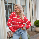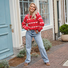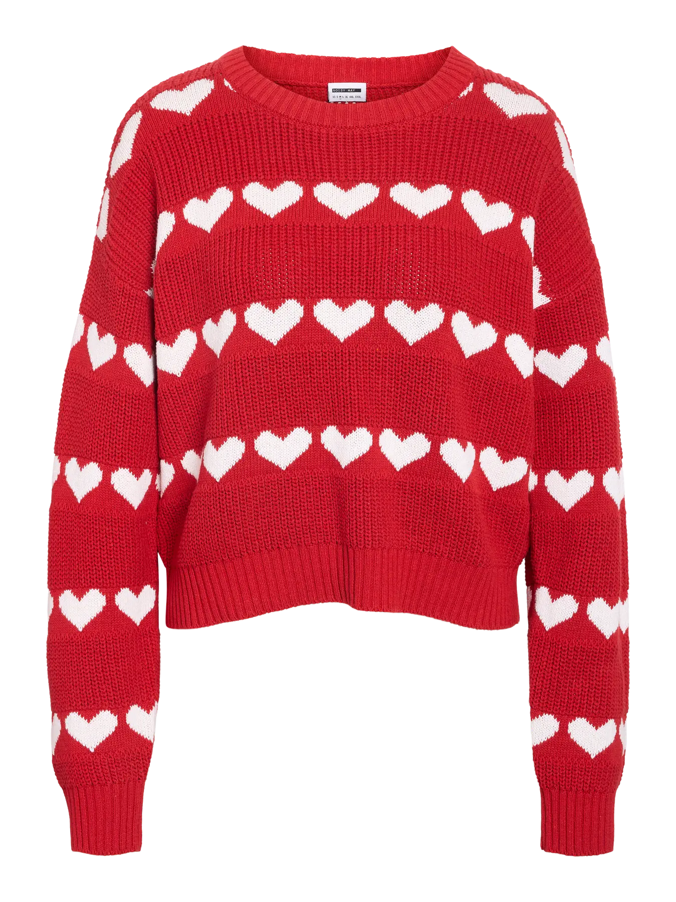 Deze nm Blitzen knit is een vrolijke, romantische trui die perfect is voor de feestdagen, maar ook daarbuiten. De trui is gebreid in een opvallende rode kleur met een patroon van contrasterende witte hartjes. De ronde hals, de zachte knit en de aansluitende pasvorm maken deze trui zowel comfortabel als stijlvol.