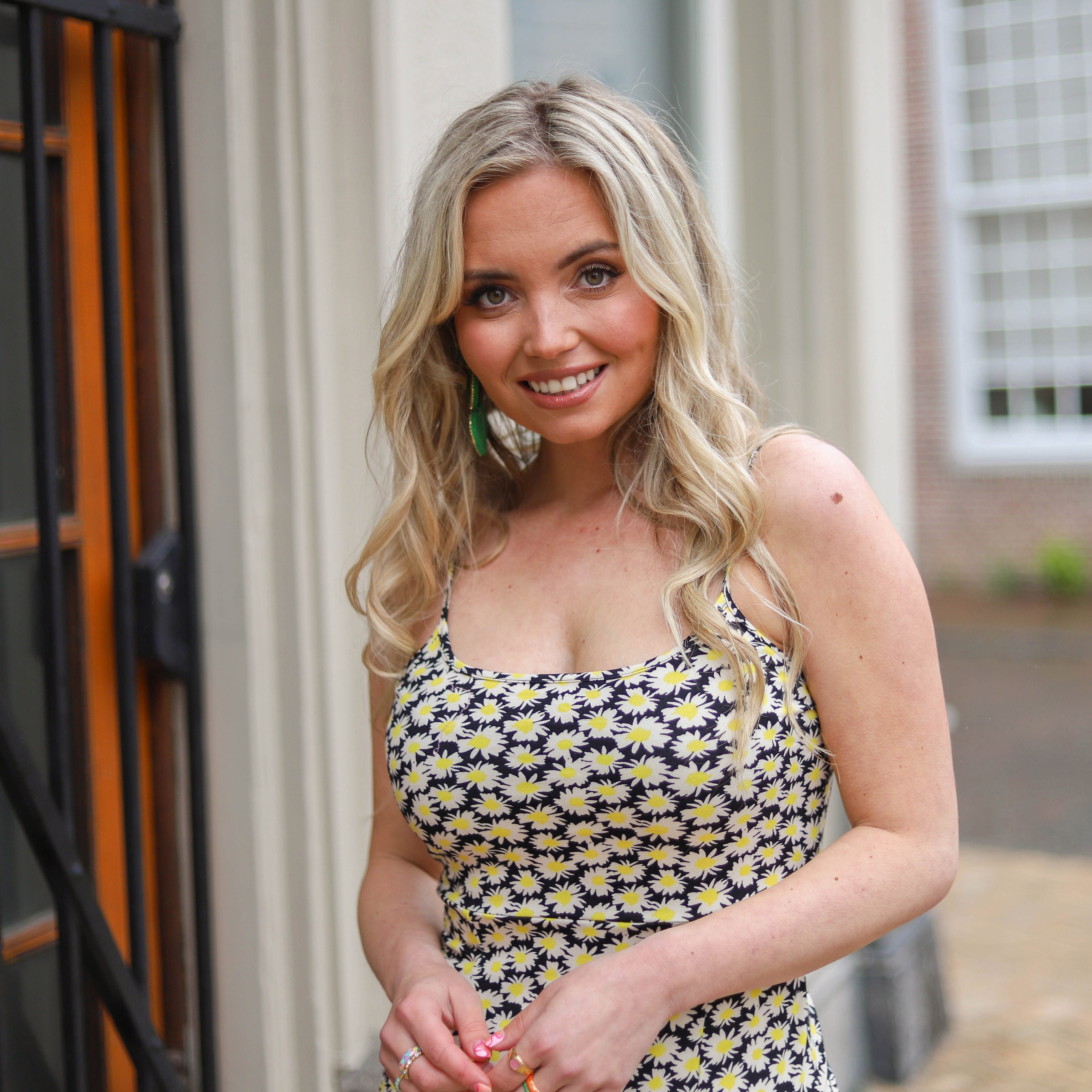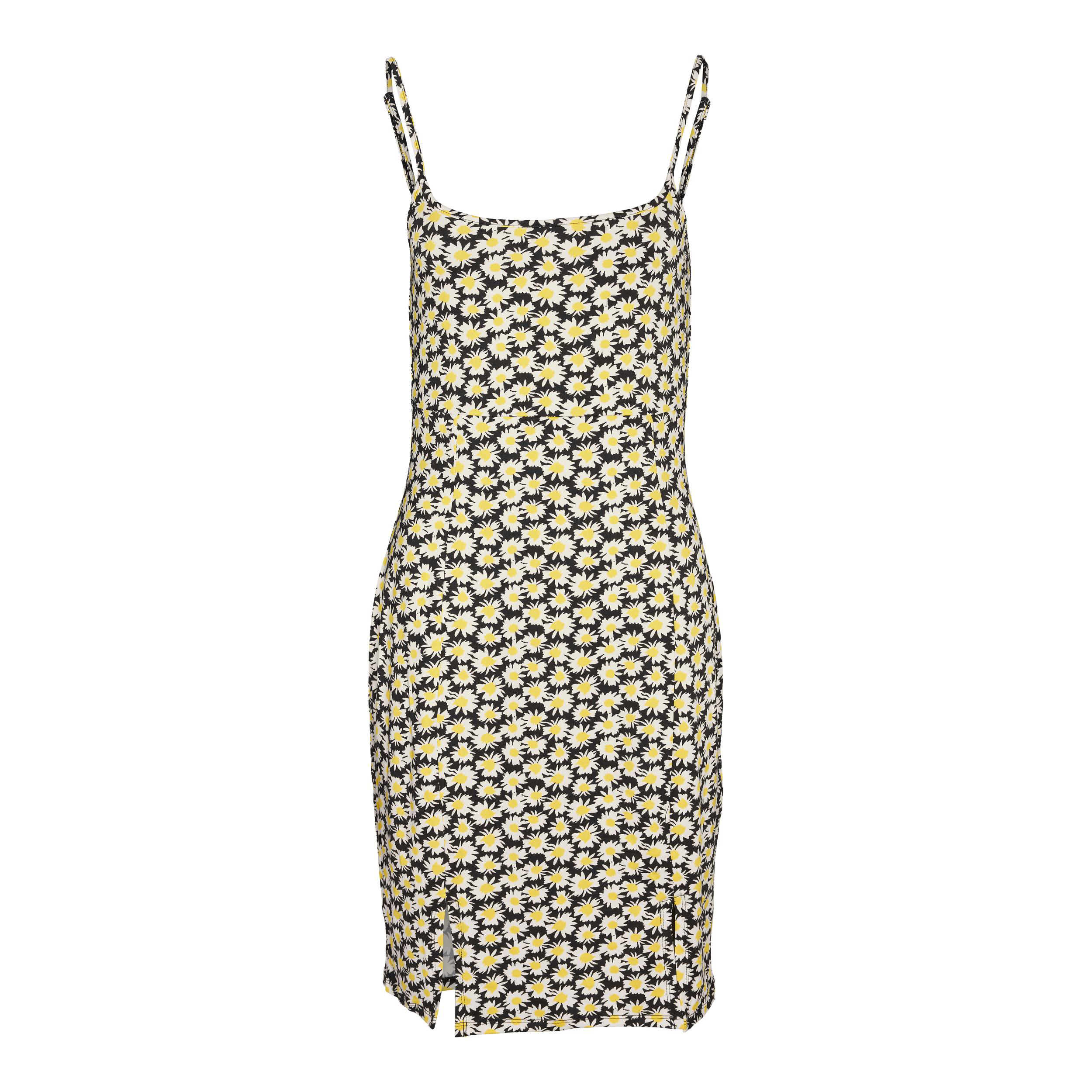 Wunderschönes Kleid mit buntem Blumendruck. Das Kleid hat einen schönen Blumendruck und einen kleinen Schlitz vorne. Runden Sie es mit einem Paar schöner Stiefel oder Sneakers ab.