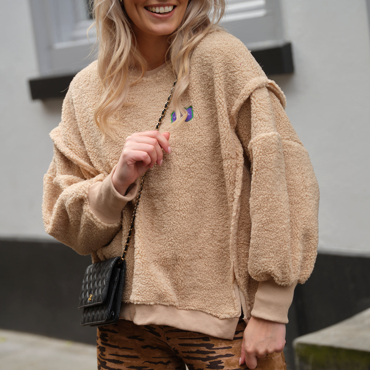 Deze Patch Sweater is de ultieme cozy trui voor de koude dagen. De trui is uitgevoerd in een heerlijk zachte teddy stofin een neutrale soft beige tint, wat zorgt voor een rijke en behaaglijke textuur. De oversized pasvorm, ronde hals en de kleine 'California' patch op de borst geven de trui een nonchalante, vintage vibe. Style 'm met een comfortabele jeans en sneakers voor een relaxte weekendlook.