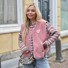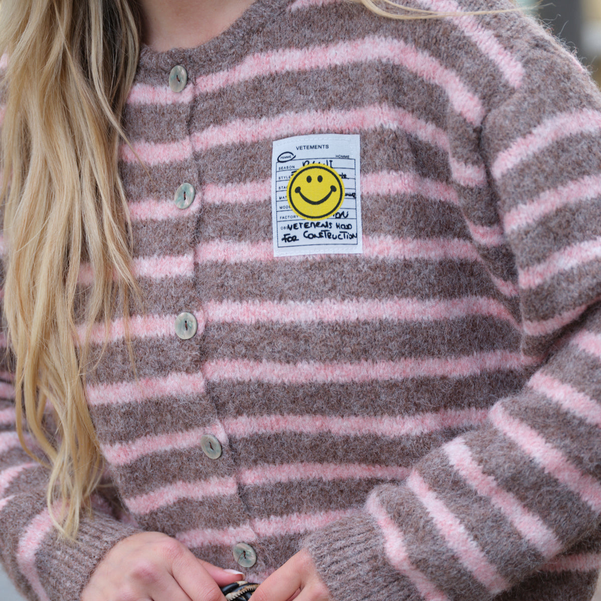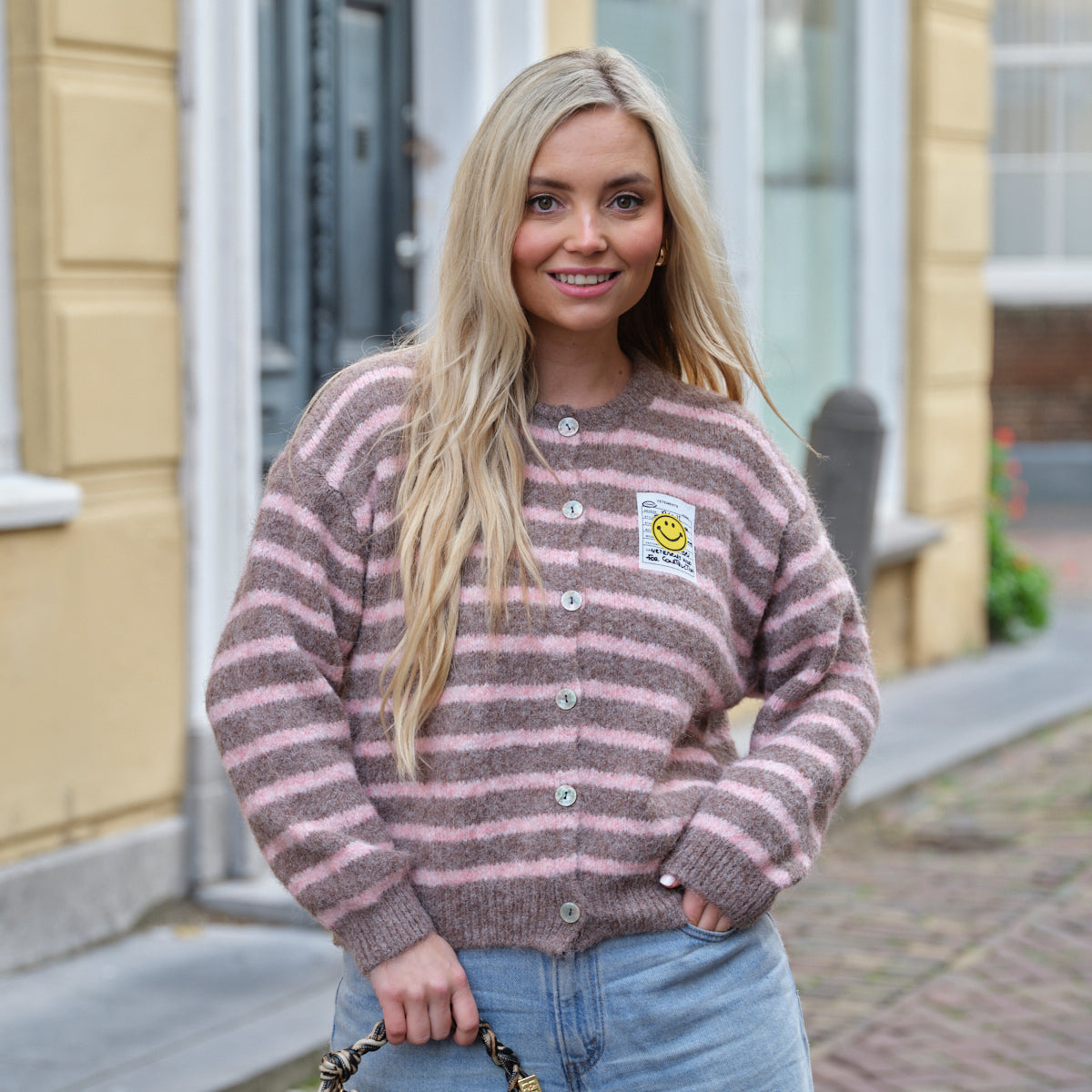 Dit Smiley Streep Vest van Jumelle is een zachte en speelse toevoeging aan je knitwear collectie. Het vest is gemaakt van een harige, gebreide stof in taupe, onderbroken door schuine, roze strepen die zorgen voor een levendige zigzag-look. Het vest heeft een klassieke, rechte pasvorm, een ronde hals zonder kraag en een knoopsluiting met subtiele knoopjes.