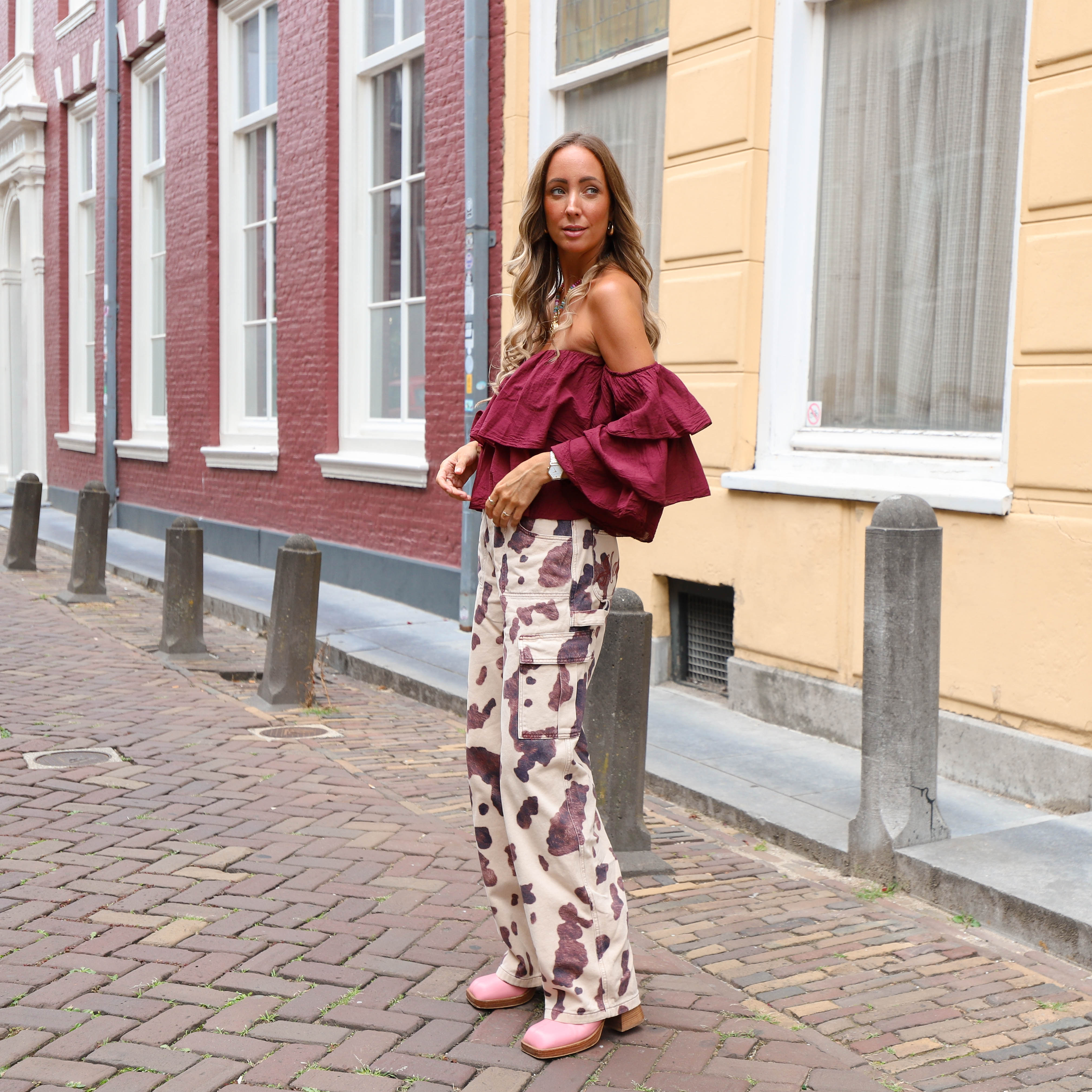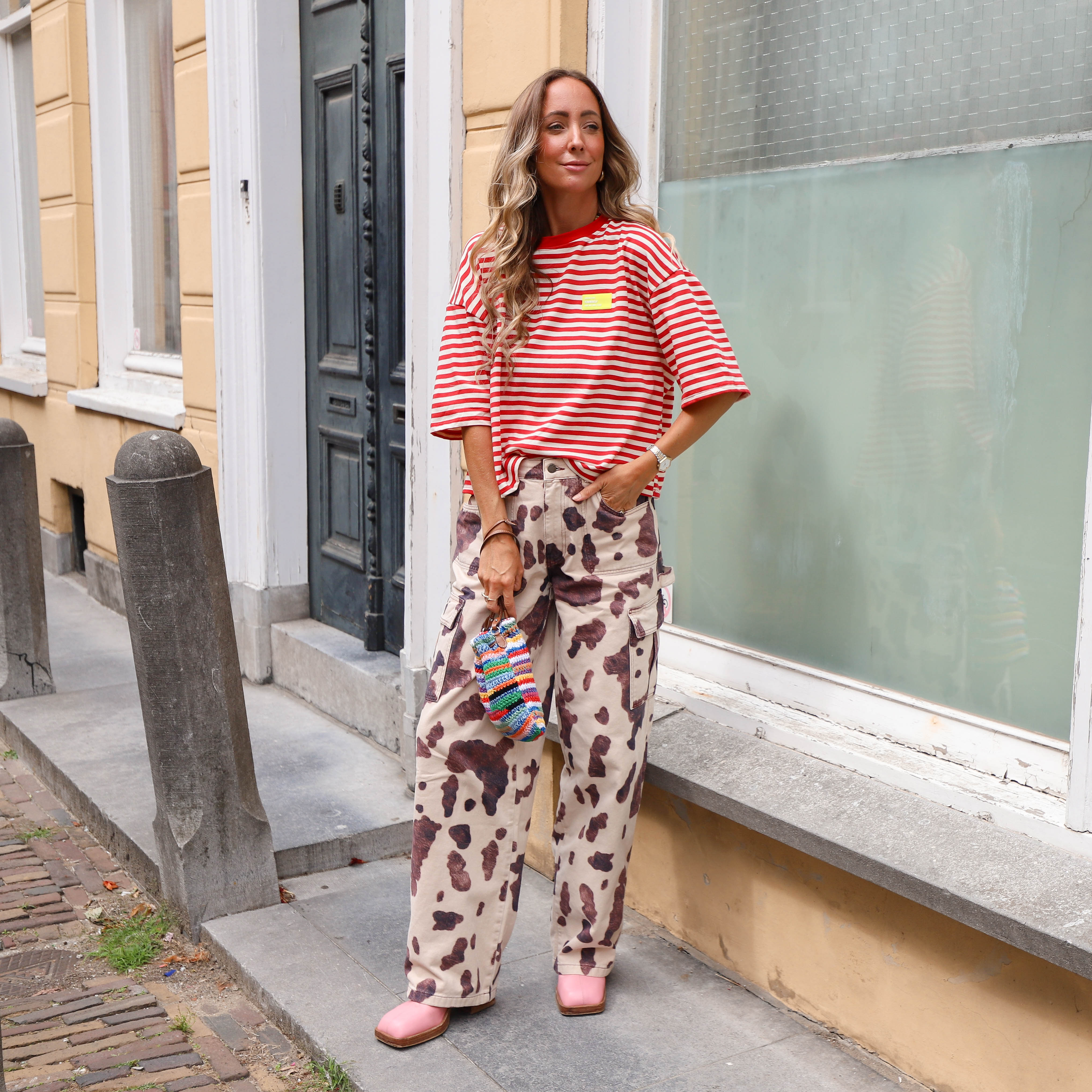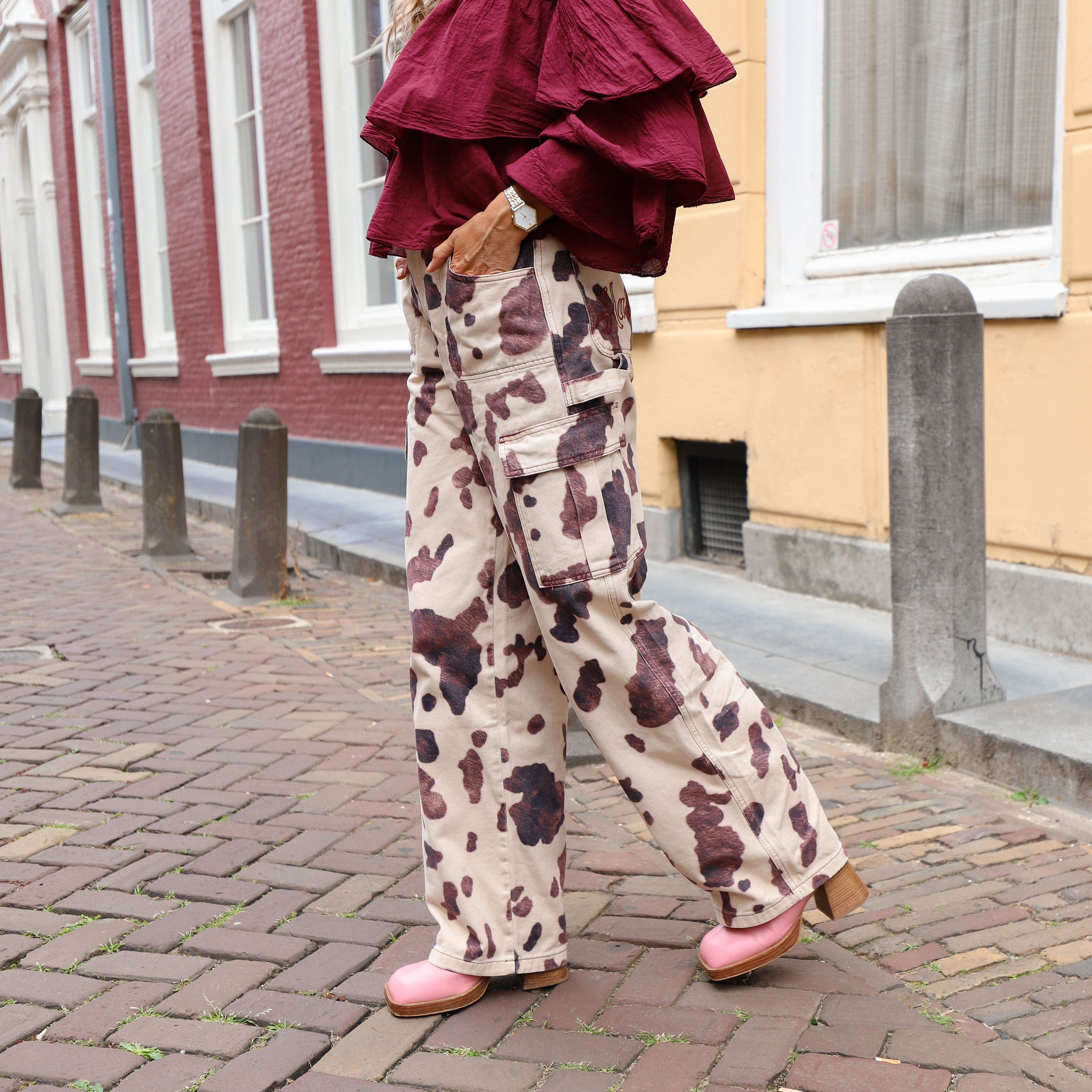 De DANA pants in COOL COW is een cargo jeans in zwart-witte koeienprint. Gemaakt van een stevige katoenen stof die mooi aansluit rond de heupen. Afgewerkt met stoere zakken en het logo op de achterzakken. Combineer met een effen top of de bijpassende FIONA jacket voor een co-ord look. Playful, powerful, and always fun.