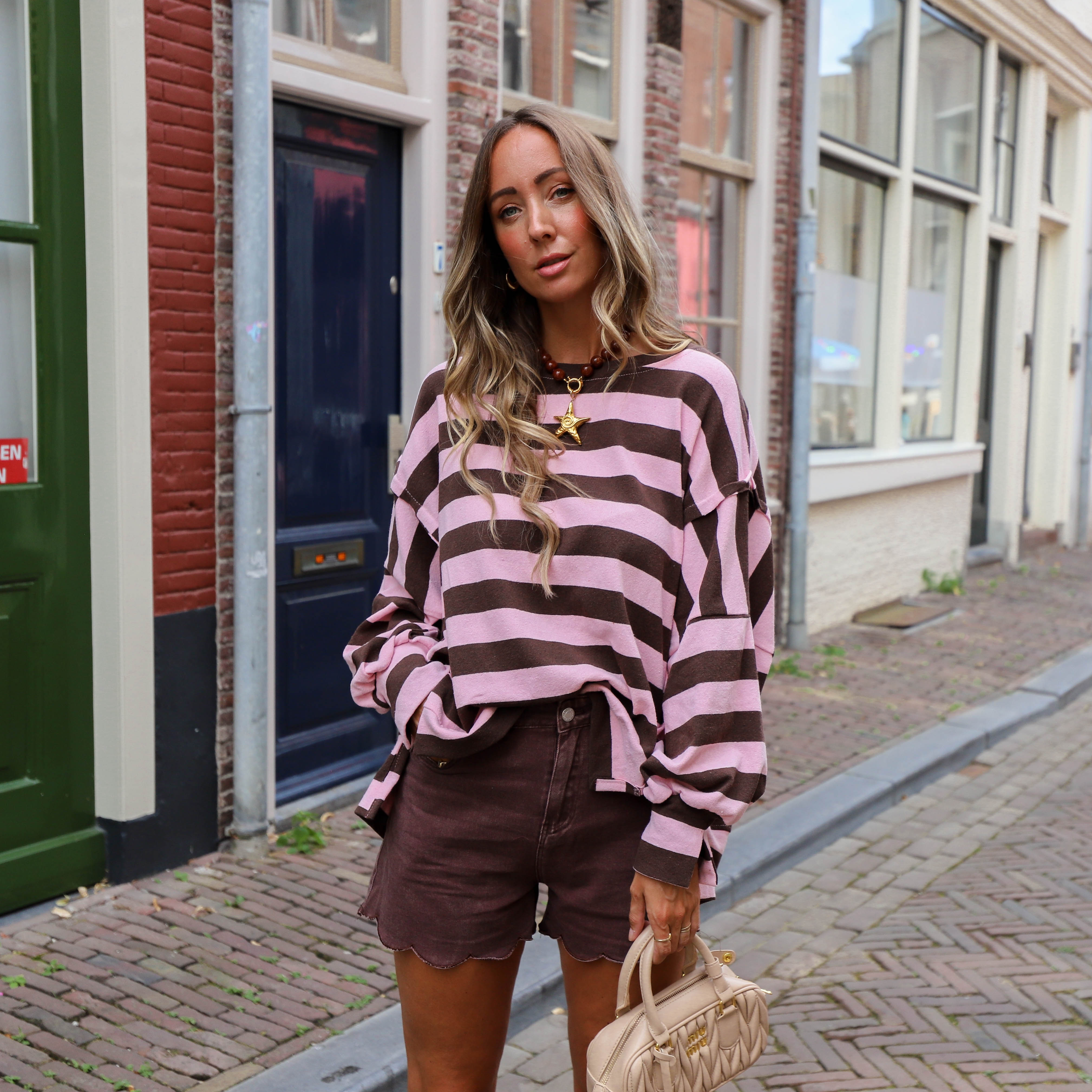 Deze unieke 'shorts Rosie café' is een charmante en trendy toevoeging aan je zomerse collectie. De shorts zijn uitgevoerd in een bruine denimkleur met een subtiele verwassen look, en vallen op door de speelse geschulpte zoomlijn.