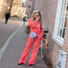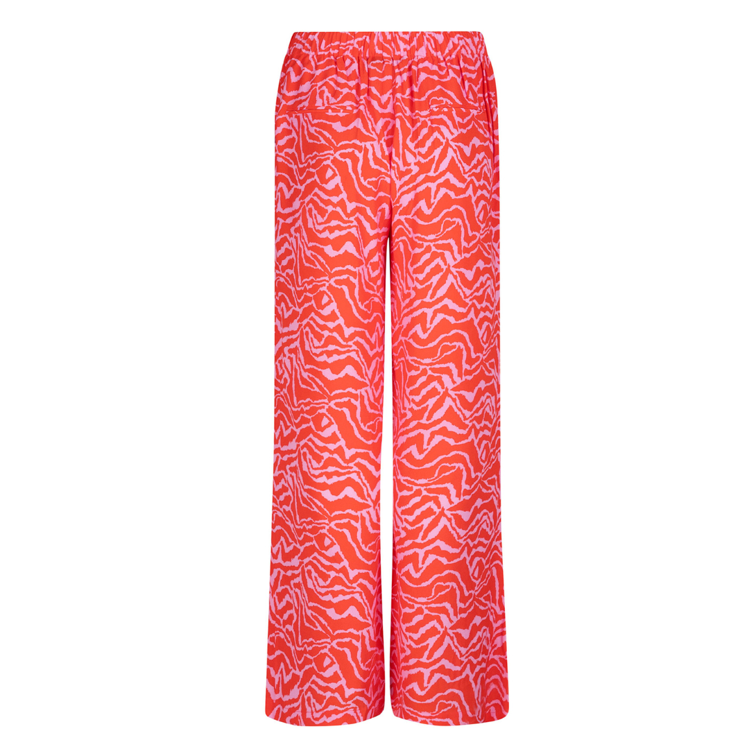 Die Hose Jenn ist eine Hose mit lustigem Aufdruck und weiten, geraden Beinen. Die Hose hat Eingrifftaschen vorne und Ziertaschen hinten. Die Hose wird mit Knopf und Reißverschluss geschlossen und hat hinten einen elastischen Bund. Schön zu kombinieren mit der passenden Bluse.