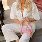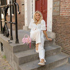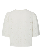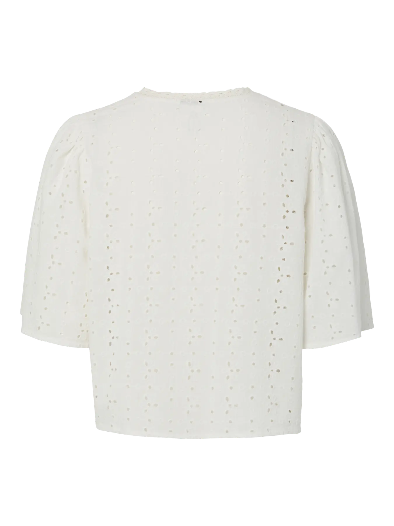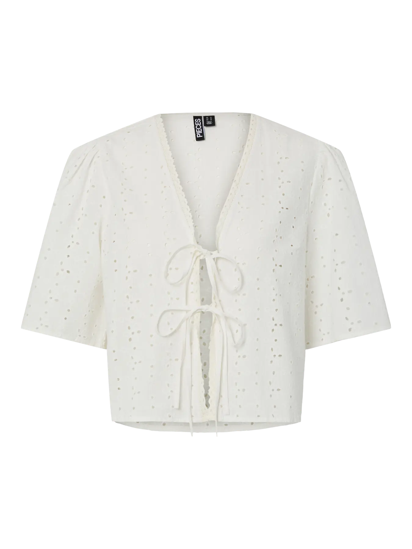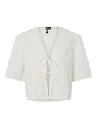 Mooie witte top met een v-hals en striksluiting aan de voorkant. De top is voorzien van een delicaat broderie anglaise patroon en heeft korte pofmouwtjes. Een perfecte, luchtige top voor de zomer.