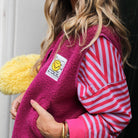 Voeg een vrolijke en warme touch toe aan je outfit met dit leuke 'smiley' teddy gilet in Burgundy fuchsia! De knoopsluiting en opgestikte zakken zorgen voor een casual look, terwijl de vrolijke 'smiley' patch op de borst een speels detail toevoegt.