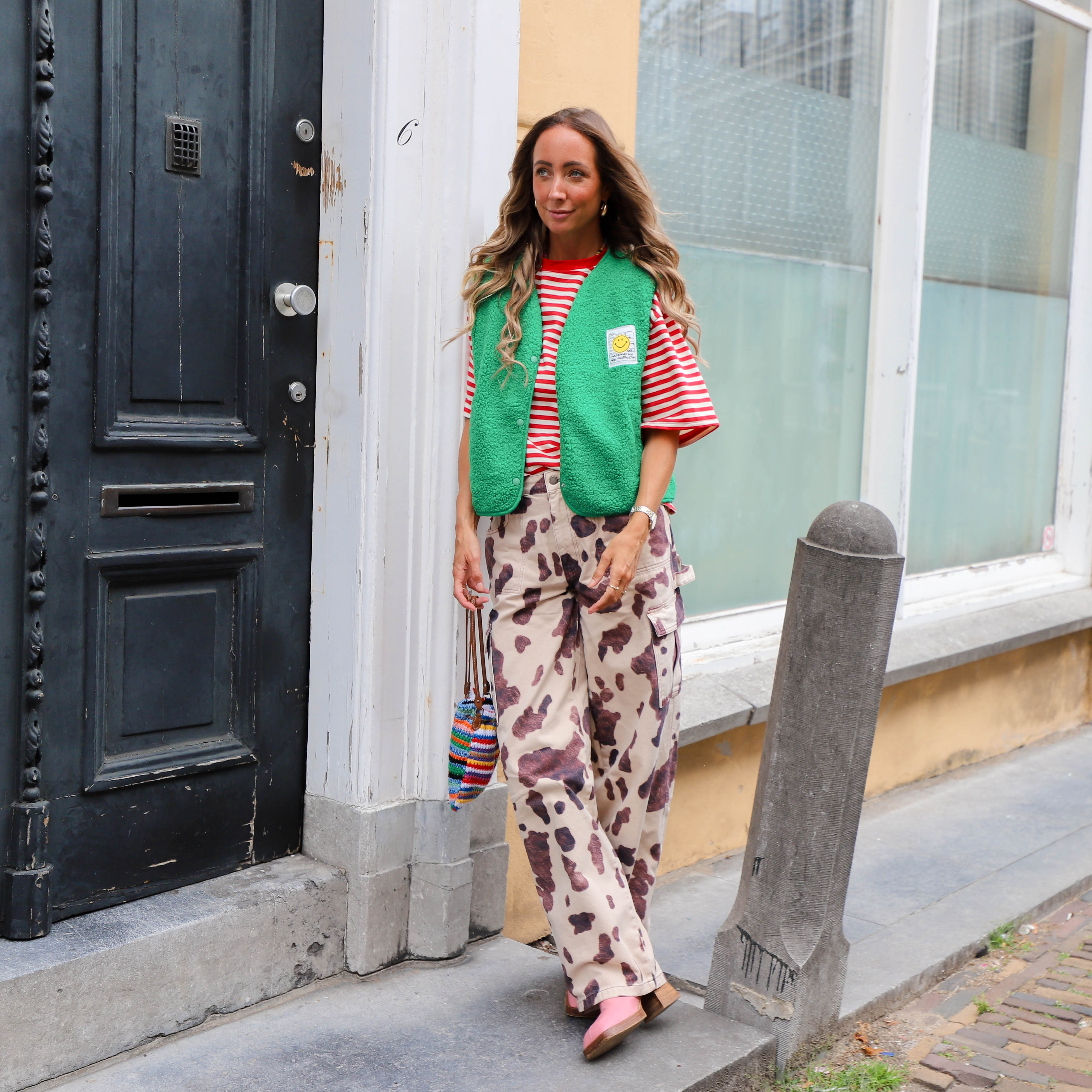 Voeg een vrolijke en warme touch toe aan je outfit met dit leuke 'smiley' teddy gilet in groen! De knoopsluiting en opgestikte zakken zorgen voor een casual look, terwijl de vrolijke 'smiley' patch op de borst een speels detail toevoegt.