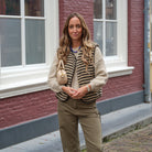 Dit leuke gilet heeft een opvallend patroon van horizontale strepen in beige en zwart en is uitgevoerd in een heerlijk zachte fleece- of teddy-stofmet een pluizige textuur. De zwarte bies rondom de randen en de V-hals zorgen voor een nette afwerking.
