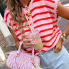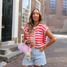 Deze gestreepte gilet een zacht en stijlvol kledingstuk. De gilet heeft een opvallend gestreept patroon in roze tinten en is voorzien van knoopjes als sluiting. Combineer met een shortje.