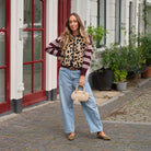 Dit trendy teddy gilet is een opvallend en heerlijk zacht statement piece. Het gilet heeft een opvallende panterprint in een neutrale combinatie van beige en zwarte vlekken. Het is uitgevoerd in een zachte, harige teddy-stof en is afgewerkt met een nette, zwarte bies langs de randen en de V-hals.