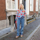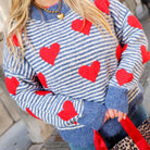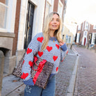 Wunderschöner Oversize-Pullover in Blau mit dünnen weißen Streifen. Der Pullover hat einen Aufdruck aus roten Herzen und sieht toll zu Jeans aus.