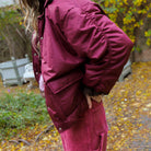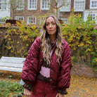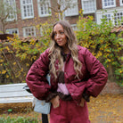 Dit Beau Bomber Jack is een trendy, korte tussenjas met een vrouwelijke twist. Het jack is uitgevoerd in een rijke, glanzende bordeauxrode kleur en heeft een klassieke, platte kraag met drukknoopsluiting. Het valt op door de geplooide, elastische details op de schouders en mouwen, wat zorgt voor een uniek silhouet. De ruime zakken aan de voorkant maken de bomber vibe compleet.