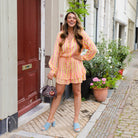 Deze playsuit is uitgevoerd in een vrolijk gestreept patroon van zacht roze en zonnig geel, wat zorgt voor een frisse en energieke uitstraling. Heerlijk voor naar een festival of strand!
