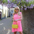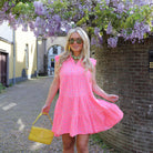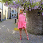 Deze vrolijke Fien Mousseline jurk met roze leopard print is een echte zomerse must-have! De jurk heeft een losse, comfortabele pasvorm met een subtiele V-hals en schattige ruffle details aan de mouwloze schouders. De gelaagde rok zorgt voor een zwierig effect.