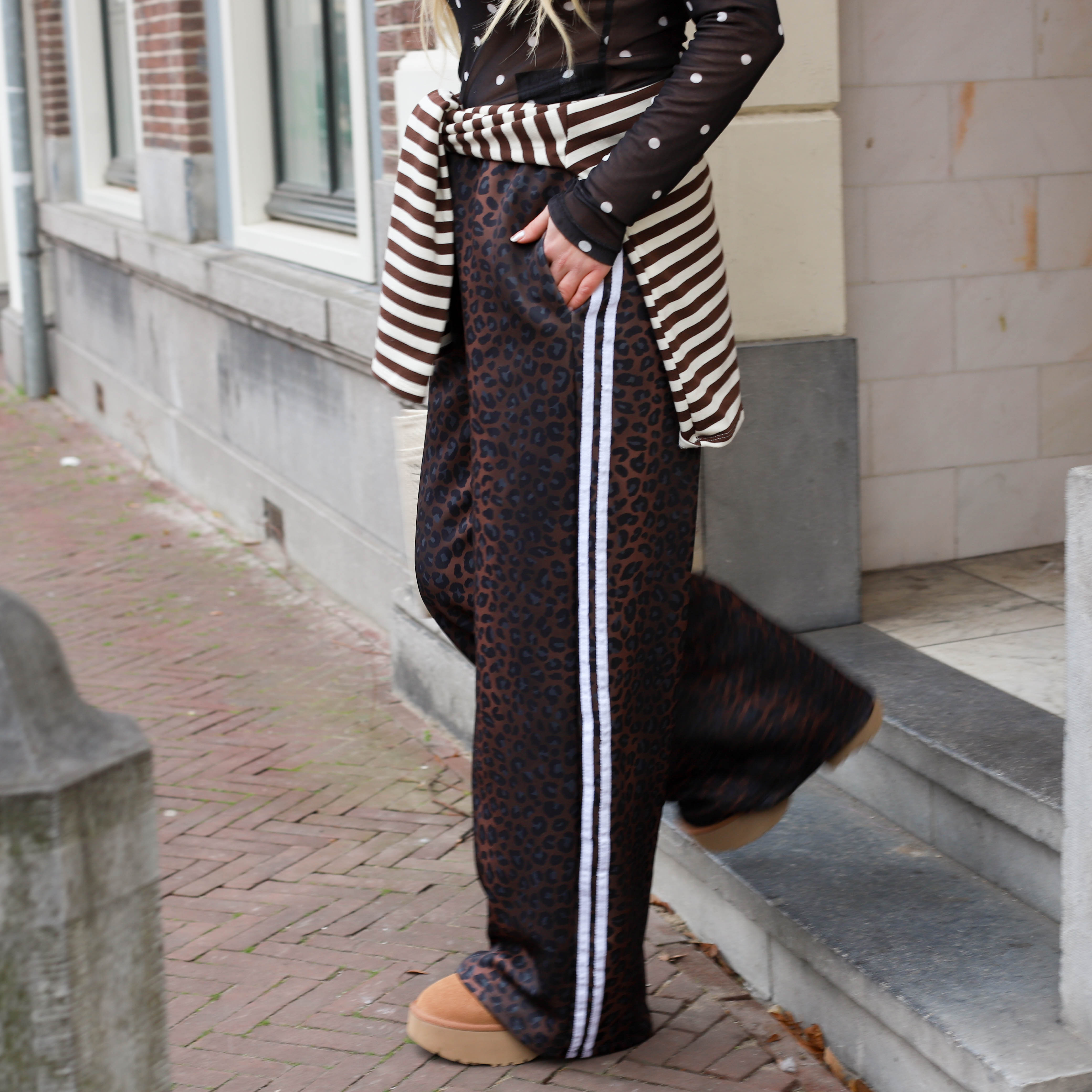 Deze Leopard Broek is een stoere en trendy toevoeging aan je casual collectie. De broek is gemaakt van een soepele, licht glanzende stof met een gedurfde leopard print in bruin- en zwarttinten.